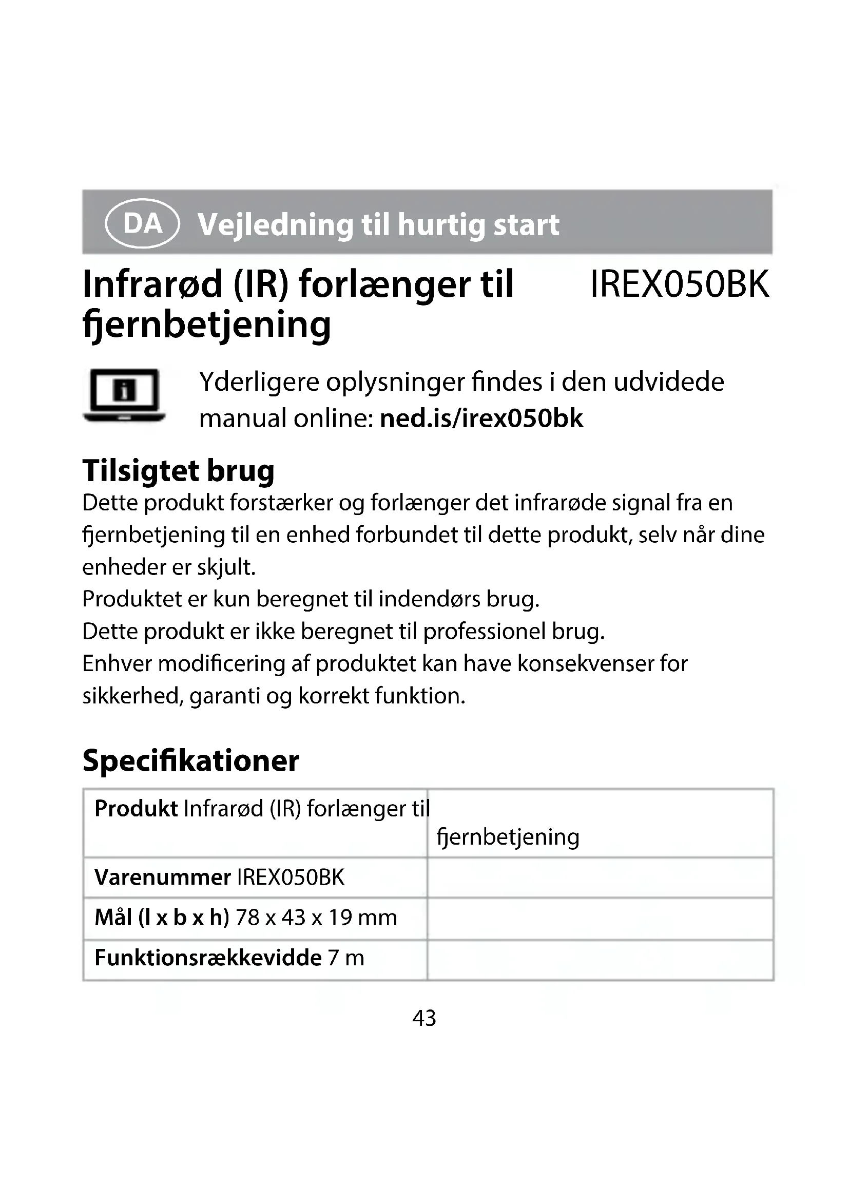 Vejledning til hurtig start Infrarød (IR) forlænger til ernbetjening IREX050BK Yderligere oplysninger ndes i den udvidede manual online: ned.is/irex050bk Tilsigtet brug Dette produkt forstærker og forlænger det infrarøde signal fra en ernbetjening til en enhed forbundet til dette produkt, selv når dine enheder er skjult. Produktet er kun beregnet til indendørs brug. Dette produkt er ikke beregnet til professionel brug. Enhver modicering af produktet kan have konsekvenser for sikkerhed, garanti og korrekt funktion. Specikationer Produkt Infrarød (IR) forlænger til ernbetjening Varenummer IREX050BK Mål (l x b x h) 78 x 43 x 19 mm Funktionsrækkevidde 7 m44 Infrarødt frekvensinterval 30 - 60 KHz Forlængerfølere 3 Y-type LED'er (1, 1,5, 2 m) Inputeekt 5 VDC ; 100 mA Strømforbrug 1 W Hoveddele (billede A)