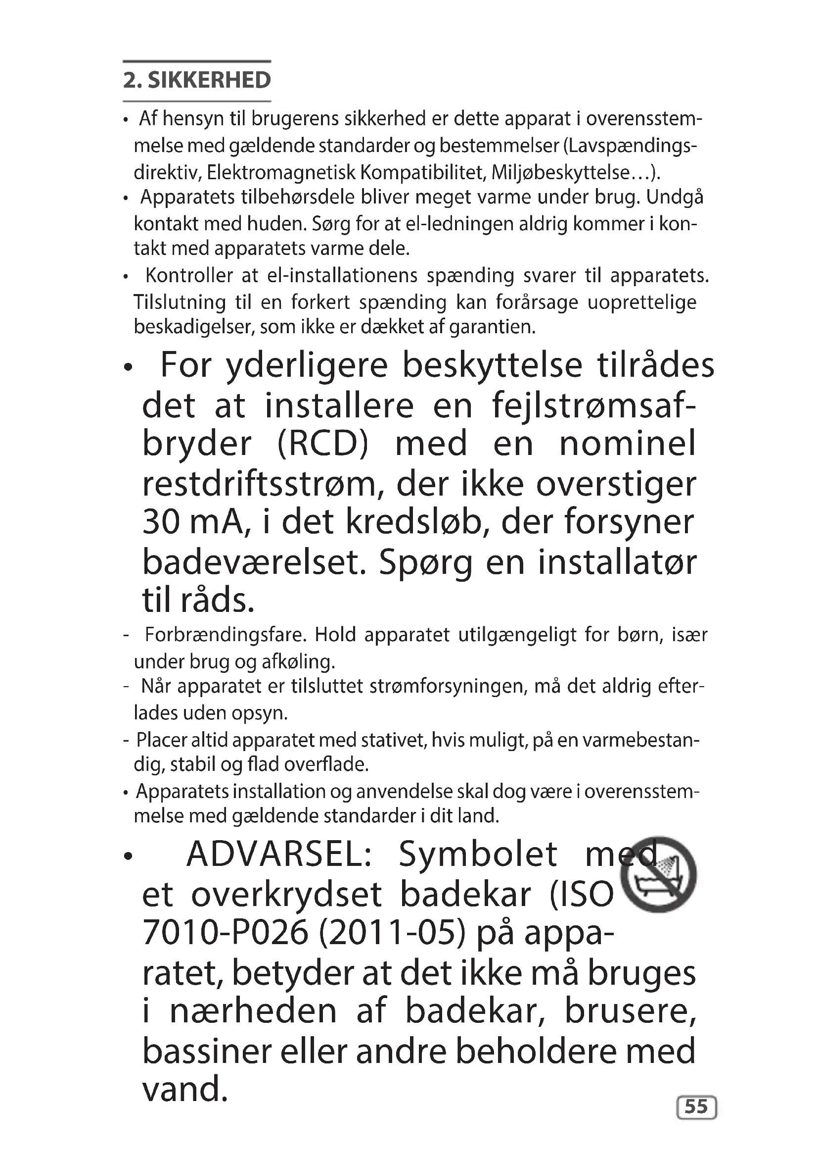 - For yderligere beskyttelse tilrådes det at installere en fejlstrømsaf- bryder (RCD) med en nominel restdriftsstrøm, der ikke overstiger 30mA, i det kredsløb, der forsyner badeværelset. Spørg en installatør til råds. - Forbrændingsfare. Hold apparatet utilgængeligt for børn, især under brug og afkøling. - Når apparatet er tilsluttet strømforsyningen, må det aldrig efter- lades uden opsyn. - Placer altid apparatet med stativet, hvis muligt, på en varmebestan- dig, stabil og ad overade.
