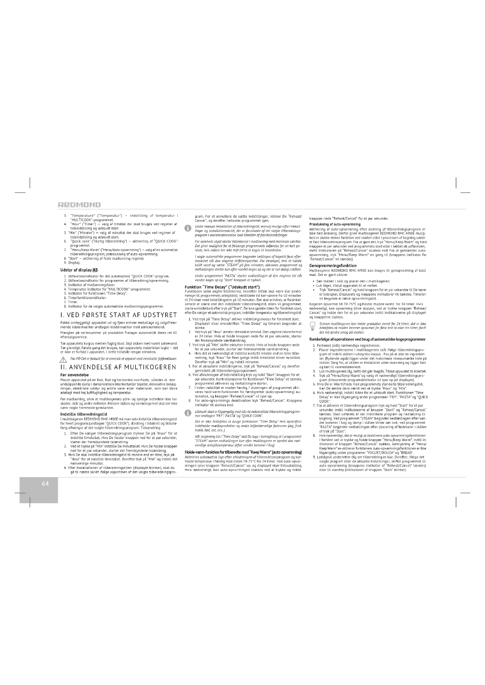 For auto-opvarmnings deaktivation tryk “Reheat/Cancel”. Knappens indikator vil slukkes ned. Udskudt-start er tilgængelig med alle de automatiske tilberedningsprogram- mer undtagen “FRY”,”PASTA” og “QUICK COOK”. Det er ikke Anbefales at bruge funktionen “Time Delay” hvis opskriften indeholder mælkeprodukter og andre letfordærvelige fødevarer (æg, frisk mælk, kød, ost, osv. ). Når angivning tid i “Time Delay” skal De tage i betragtning at i programmet “STEAM” starter nedtællingen kun efter multikogeren er opnået den nød- vendige arbejdstemperatur (efter vandet kommer i kog). Holde-varm-funktion for tilberedte mad “Keep Warm” (auto opvarmning) Aktiveres automatisk lige efter afslutningen af tilberedelsesprogram og kan holde temperatur i færdig mad inden 70-75°C for 24 timer. Ved auto-opvar- mingen lyser knappen “Reheat/Cancel” op, og displayet viser tidsoptælling. Hvis nødvendigt, kan auto-opvarmingen slukkes ved at trykke og holde knappen nede “Reheat/Cancel” for et par sekunder. Præslukning af auto-opvarmning Aktivering af auto-opvarmning efter slutning af tilberedningsprogram er ikke helt ønskelig. Derfor giver multikogeren REDMOND RMC-M90E mulig- hed at slukke denne funktion ved starten eller i processen af kogning under et fast tilberedninsprogram. For at gøre det, tryk “Menu/Keep Warm” og hold knappen et par sekunder ved programmets start eller i løbbet ab udførelsen, indtil indikatoren på “Reheat/Cancel” slukkes ned. For at gentænder auto- opvarmning, tryk “Menu/Keep Warm” en gang til (knappens indikator for “Reheat/Cancel” vil tændes). Genopvarmningsfunktion Multikogeren REDMOND RMC-M90E kan bruges til genopvarming af kold mad. Det er gjort sådant: