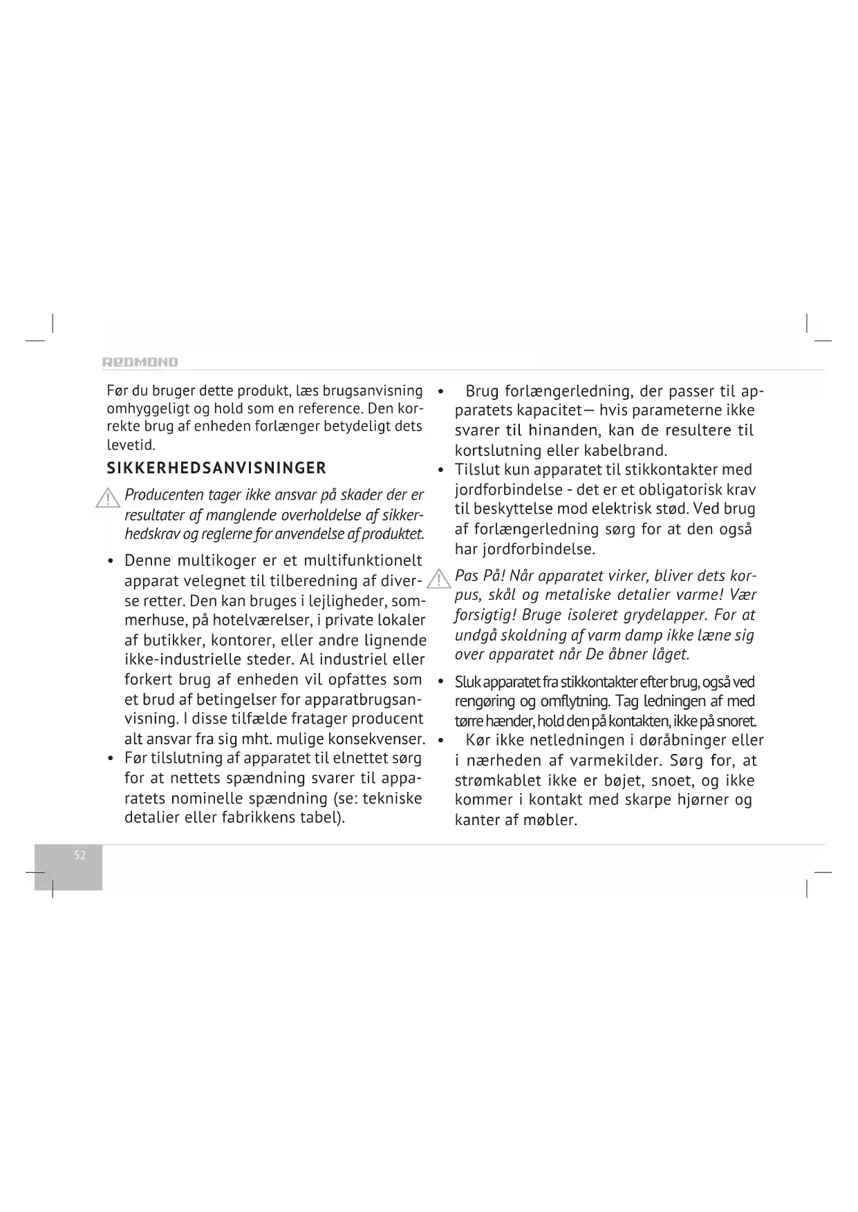 Denne multikoger er et multifunktionelt apparat velegnet til tilberedning af diver- se retter. Den kan bruges i lejligheder, som- merhuse, på hotelværelser, i private lokaler af butikker, kontorer, eller andre lignende ikke-industrielle steder. Al industriel eller forkert brug af enheden vil opfattes som et brud af betingelser for apparatbrugsan- visning. I disse tilfælde fratager producent alt ansvar fra sig mht. mulige konsekvenser.