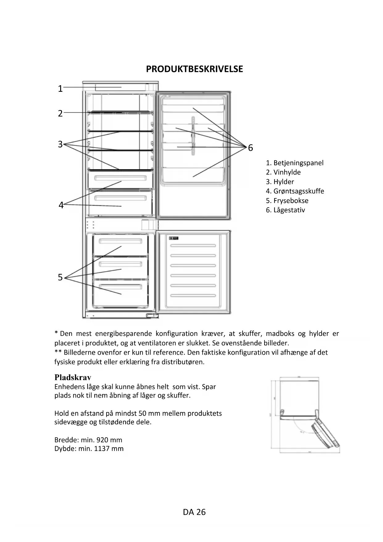 - Den mest energibesparende konfiguration kræver, at skuffer, madboks og hylder erplaceret i produktet, og at ventilatoren er slukket. Se ovenstående billeder.** Billederne ovenfor er kun til reference. Den faktiske konfiguration vil afhænge af detfysiske produkt eller erklæring fra distributøren.Pladskrav Enhedens låge skal kunne åbnes helt som vist. Spar plads nok til nem åbning af låger og skuffer. Hold en afstand på mindst 50 mm mellem produktets sidevægge og tilstødende dele.Bredde: min. 920 mm Dybde: min. 1137 mm1. Betjeningspanel2. Vinhylde3. Hylder4. Grøntsagsskuffe5. Frysebokse6. Lågestativ