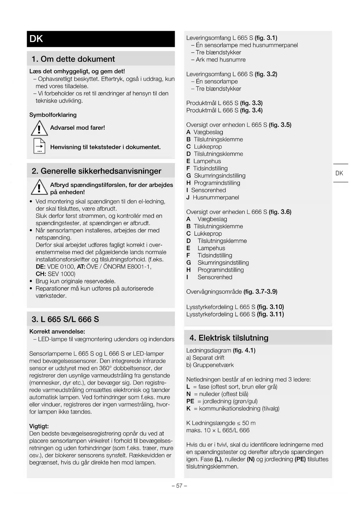 Korrekt anvendelse: – LED-lampe til vægmontering udendørs og indendørs Sensorlamperne L 665 S og L 666 S er LED-lamper med bevægelsessensorer. Den integrerede infrarøde sensor er udstyret med en 360° dobbeltsensor, der registrerer den usynlige varmeudstråling fra genstande (mennesker, dyr etc.), der bevæger sig. Den registre- rede varmeudstråling omsættes elektronisk og tænder automatisk lampen. Ved forhindringer som f.eks. mure eller vinduer, registreres der ingen varmestråling, hvor- for lampen ikke tændes. Vigtigt: Den bedste bevægelsesregistrering opnår du ved at placere sensorlampen vinkelret i forhold til bevægelses- retningen og uden forhindringer (som f.eks. træer, mure osv.), der blokerer sensorens synsfelt. Rækkevidden er begrænset, hvis du går direkte hen mod lampen. Leveringsomfang L 665 S (fig. 3.1) – Én sensorlampe med husnummerpanel – Tre blændstykker – Ark med husnumre Leveringsomfang L 666 S (fig. 3.2) – Én sensorlampe – Tre blændstykker Produktmål L 665 S (fig. 3.3) Produktmål L 666 S (fig. 3.4) Oversigt over enheden L 665 S (fig. 3.5) A Vægbeslag B Tilslutningsklemme C Lukkeprop D Tilslutningsklemme E Lampehus F Tidsindstilling G Skumringsindstilling H Programindstilling I Sensorenhed J Husnummerpanel Oversigt over enheden L 666 S (fig. 3.6) A Vægbeslag B Tilslutningsklemme C Lukkeprop D Tilslutningsklemme E Lampehus F Tidsindstilling G Skumringsindstilling H Programindstilling I Sensorenhed Overvågningsområde (fig. 3.7-3.9) Lysstyrkefordeling L665S (fig.3.10) Lysstyrkefordeling L666S (fig.3.11)