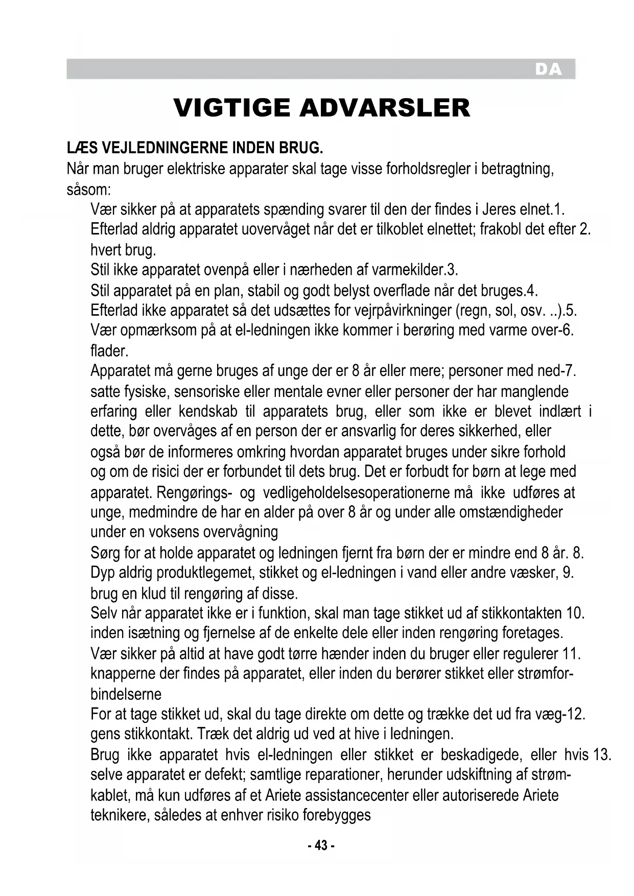 VIGTIGE ADVARSLER LÆS VEJLEDNINGERNE INDEN BRUG. Når man bruger elektriske apparater skal tage visse forholdsregler i betragtning, såsom: Vær sikker på at apparatets spænding svarer til den der findes i Jeres elnet.1. Efterlad aldrig apparatet uovervåget når det er tilkoblet elnettet; frakobl det efter 2. hvert brug. Stil ikke apparatet ovenpå eller i nærheden af varmekilder.3. Stil apparatet på en plan, stabil og godt belyst overflade når det bruges.4. Efterlad ikke apparatet så det udsættes for vejrpåvirkninger (regn, sol, osv. ..).5. Vær opmærksom på at el-ledningen ikke kommer i berøring med varme over-6. flader. Apparatet må gerne bruges af unge der er 8 år eller mere; personer med ned-7. satte fysiske, sensoriske eller mentale evner eller personer der har manglende erfaring eller kendskab til apparatets brug, eller som ikke er blevet indlært i dette, bør overvåges af en person der er ansvarlig for deres sikkerhed, eller også bør de informeres omkring hvordan apparatet bruges under sikre forhold og om de risici der er forbundet til dets brug. Det er forbudt for børn at lege med apparatet. Rengørings- og vedligeholdelsesoperationerne må ikke udføres at unge, medmindre de har en alder på over 8 år og under alle omstændigheder under en voksens overvågning Sørg for at holde apparatet og ledningen fjernt fra børn der er mindre end 8 år. 8. Dyp aldrig produktlegemet, stikket og el-ledningen i vand eller andre væsker, 9. brug en klud til rengøring af disse. Selv når apparatet ikke er i funktion, skal man tage stikket ud af stikkontakten 10. inden isætning og fjernelse af de enkelte dele eller inden rengøring foretages. Vær sikker på altid at have godt tørre hænder inden du bruger eller regulerer 11. knapperne der findes på apparatet, eller inden du berører stikket eller strømfor- bindelserne For at tage stikket ud, skal du tage direkte om dette og trække det ud fra væg-12. gens stikkontakt. Træk det aldrig ud ved at hive i ledningen. Brug ikke apparatet hvis el-ledningen eller stikket er beskadigede, eller hvis 13. selve apparatet er defekt; samtlige reparationer, herunder udskiftning af strøm- kablet, må kun udføres af et Ariete assistancecenter eller autoriserede Ariete teknikere, således at enhver risiko forebyggesDA