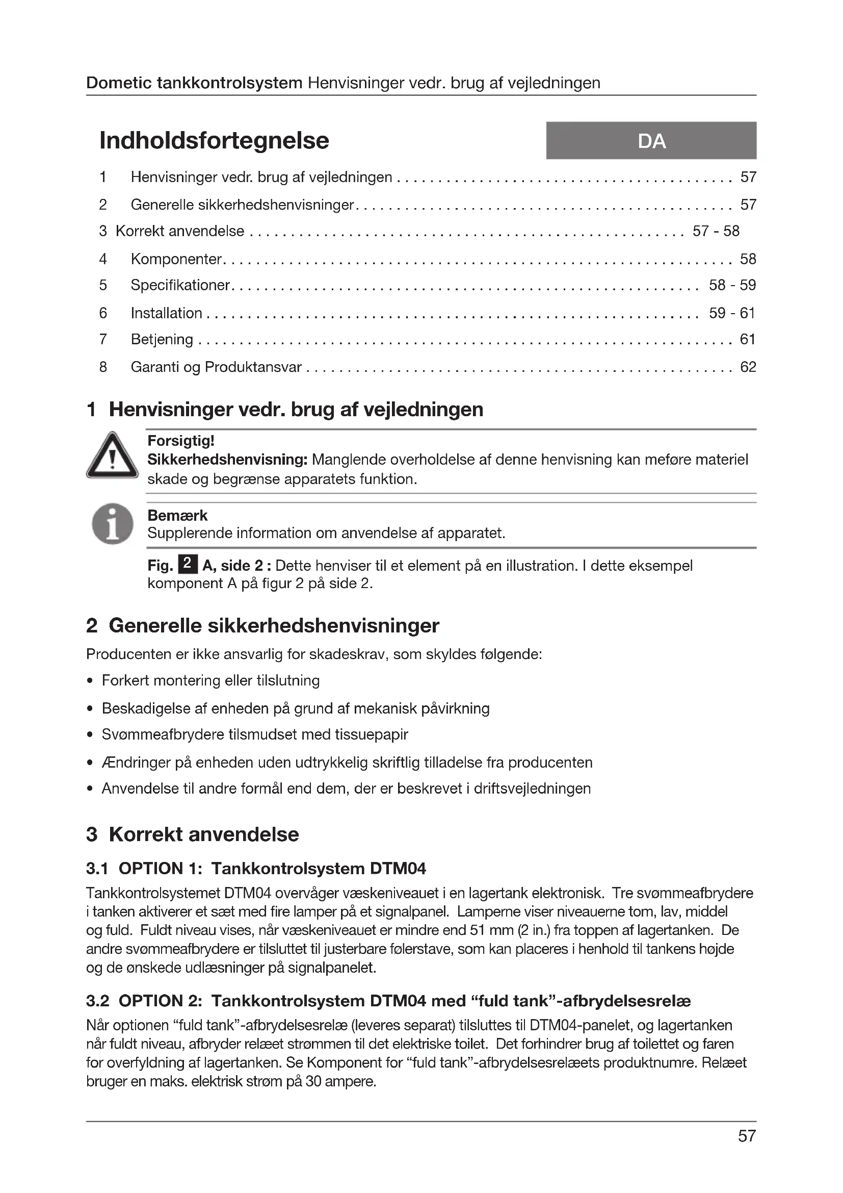 - Anvendelse til andre formål end dem, der er beskrevet i driftsvejledningen 3 Korrekt anvendelse58 Dometic tankkontrolsystemKorrekt anvendelse