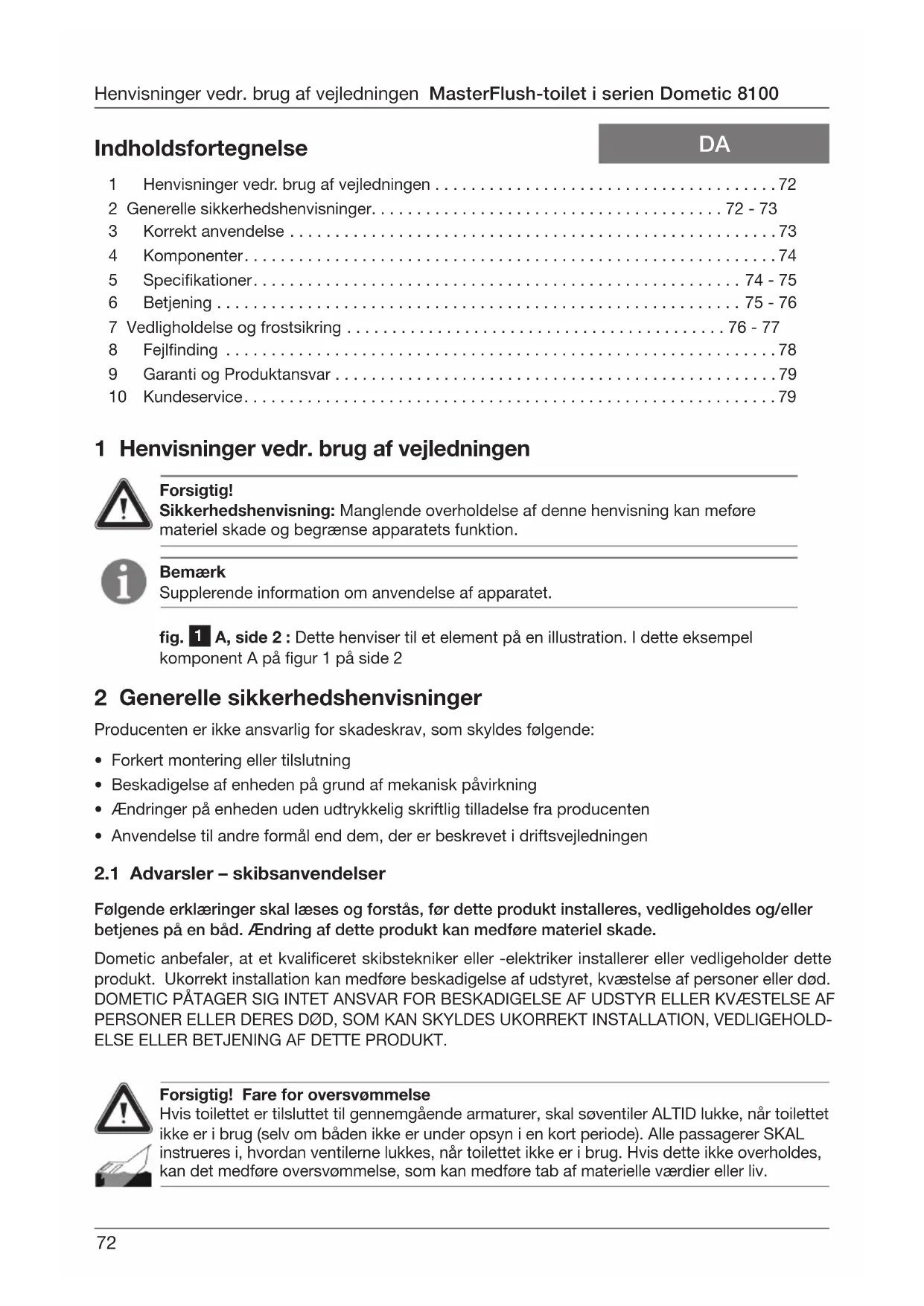 - Anvendelse til andre formål end dem, der er beskrevet i driftsvejledningen Henvisninger vedr. brug af vejledningen MasterFlush-toilet i serien Dometic 8100 Forsigtig! Fare for oversvømmelse Hvis toilettet er tilsluttet til gennemgående armaturer, skal søventiler ALTID lukke, når toilettet ikke er i brug (selv om båden ikke er under opsyn i en kort periode). Alle passagerer SKAL instrueres i, hvordan ventilerne lukkes, når toilettet ikke er i brug. Hvis dette ikke overholdes, kan det medføre oversvømmelse, som kan medføre tab af materielle værdier eller liv.73 MasterFlush-toilet i serien Dometic 8100 Generelle sikkerhedshenvisninger Forsigtig! Fare for oversvømmelse Hvis toilettet bruger ferskvand til skylning og er tilsluttet direkte eller indirekte til et kommun- alt vandsystem på land på NOGET SOM HELST tidspunkt, SKAL tilslutningerne til vand på land afbrydes, hvis båden ikke er under opsyn (selv om båden ikke er under opsyn i en kort periode). Hvis dette ikke overholdes, kan det medføre oversvømmelse, som kan medføre tab af materielle værdier eller liv. Forsigtig! Fare for oversvømmelse Før arbejde påbegyndes på dette produkt, skal al strømforsyning til enheden slukkes og søventilerne placeres i positionen LUKKET eller FRA. Hvis dette ikke overholdes, kan det medføre oversvømmelse, som kan medføre tab af materielle værdier eller liv. Forsigtig! Overfyldning af lagertanken kan medføre alvorlig beskadigelse af sanitetssystemet, som f.eks. at lagertanken brister og lukker tankens indhold ud i bunden. For at undgå denne mulighed anbefaler Dometic at bruge afbrydelsesrelæet for “fuld” tank i toilettets elektroni- ske styremodul. Signalet “fuld” fra lagertanken kan frembringes af en ekstra tankmonitor Dometic DTM01C eller et tankkontrolsystem DTM04 med re niveauer. 3 Korrekt anvendelse MasterFlush-toilettet i serien Dometic 8100 er et elektrisk skyllet toilet, som ndeler affald og pumper det til en lagertank eller andet spildevandslager- eller -bortskaffelsessystem. Toilettet betjenes med en vægmonteres skyllekontakt og gør det muligt for brugeren at tilføre vand til kummen (før eller efter skylning) og at skylle toilettet ved at trykke på en knap.