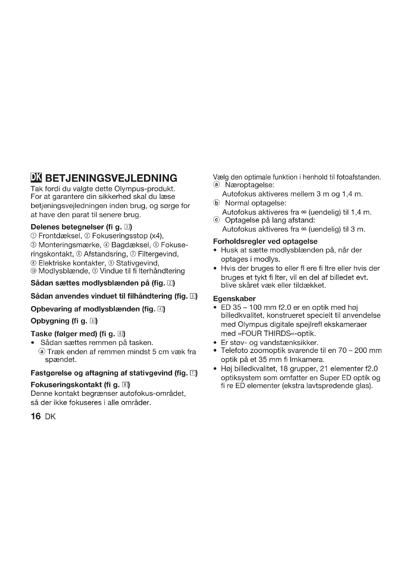 Optagelse på lang afstand: Autofokus aktiveres fra ∞ (uendelig) til 3 m. Forholdsregler ved optagelse Husk at sætte modlysblænden på, når der optages i modlys. Hvis der bruges to eller fl ere fi ltre eller hvis der bruges et tykt fi lter, vil en del af billedet evt. blive skåret væk eller tildækket. Egenskaber ED 35 – 100 mm f2.0 er en optik med høj billedkvalitet, konstrueret specielt til anvendelse med Olympus digitale spejlrefl ekskameraer med »FOUR THIRDS«-optik. Er støv- og vandstænksikker. Telefoto zoomoptik svarende til en 70 – 200 mm optik på et 35 mm fi lmkamera. Høj billedkvalitet, 18 grupper, 21 elementer f2.0 optiksystem som omfatter en Super ED optik og fi re ED elementer (ekstra lavtspredende glas).