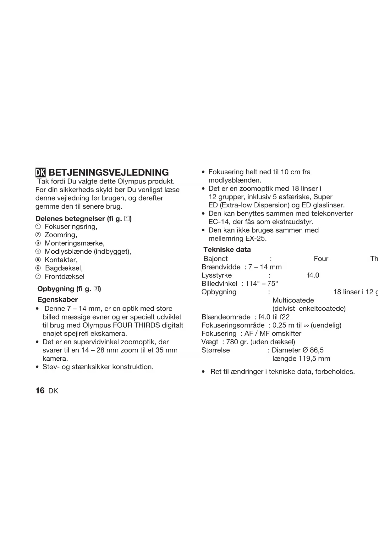 - 16 DK BETJENINGSVEJLEDNING Tak fordi Du valgte dette Olympus produkt. For din sikkerheds skyld bør Du venligst læse denne vejledning før brugen, og derefter gemme den til senere brug. Delenes betegnelser (fi g. 1) 1 Fokuseringsring, 2 Zoomring, 3 Monteringsmærke, 4 Modlysblænde (indbygget), 5 Kontakter, 6 Bagdæksel, 7 Frontdæksel Opbygning (fi g. 2) Egenskaber Denne 7 – 14 mm, er en optik med store billed mæssige evner og er specielt udviklet til brug med Olympus FOUR THIRDS digitalt enøjet spejlrefl ekskamera. Det er en supervidvinkel zoomoptik, der svarer til en 14 – 28 mm zoom til et 35 mm kamera. Støv- og stænksikker konstruktion.