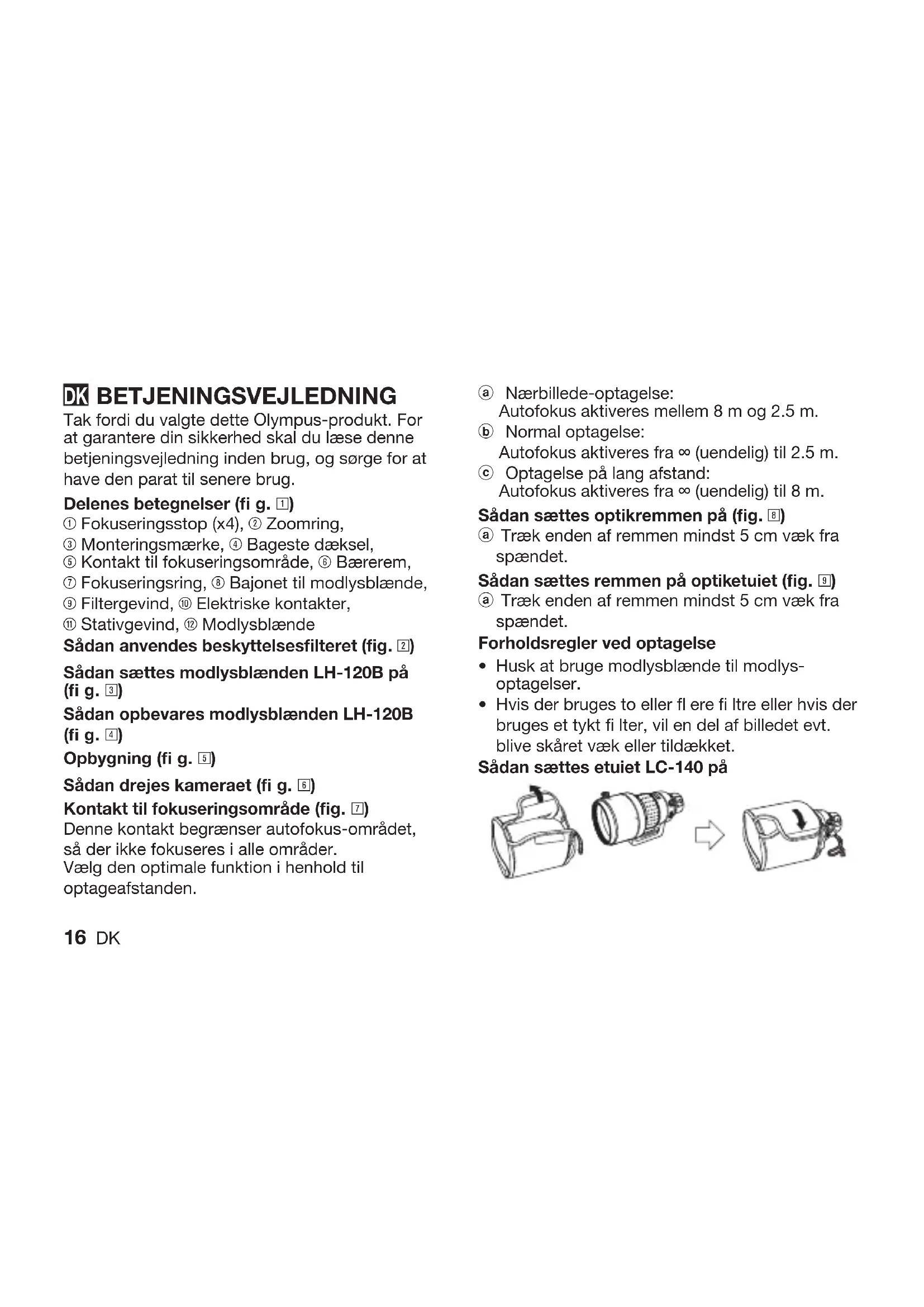 - 16 DK BETJENINGSVEJLEDNING Tak fordi du valgte dette Olympus-produkt. For at garantere din sikkerhed skal du læse denne betjeningsvejledning inden brug, og sørge for at have den parat til senere brug. Delenes betegnelser (fi g. 1) 1 Fokuseringsstop (x4), 2 Zoomring, 3 Monteringsmærke, 4 Bageste dæksel, 5 Kontakt til fokuseringsområde, 6 Bærerem, 7 Fokuseringsring, 8 Bajonet til modlysblænde, 9 Filtergevind, 0 Elektriske kontakter, q Stativgevind, w Modlysblænde Sådan anvendes beskyttelsesfi lteret (fi g. 2) Sådan sættes modlysblænden LH-120B på (fi g. 3) Sådan opbevares modlysblænden LH-120B (fi g. 4) Opbygning (fi g. 5) Sådan drejes kameraet (fi g. 6) Kontakt til fokuseringsområde (fi g. 7) Denne kontakt begrænser autofokus-området, så der ikke fokuseres i alle områder. Vælg den optimale funktion i henhold til optageafstanden.