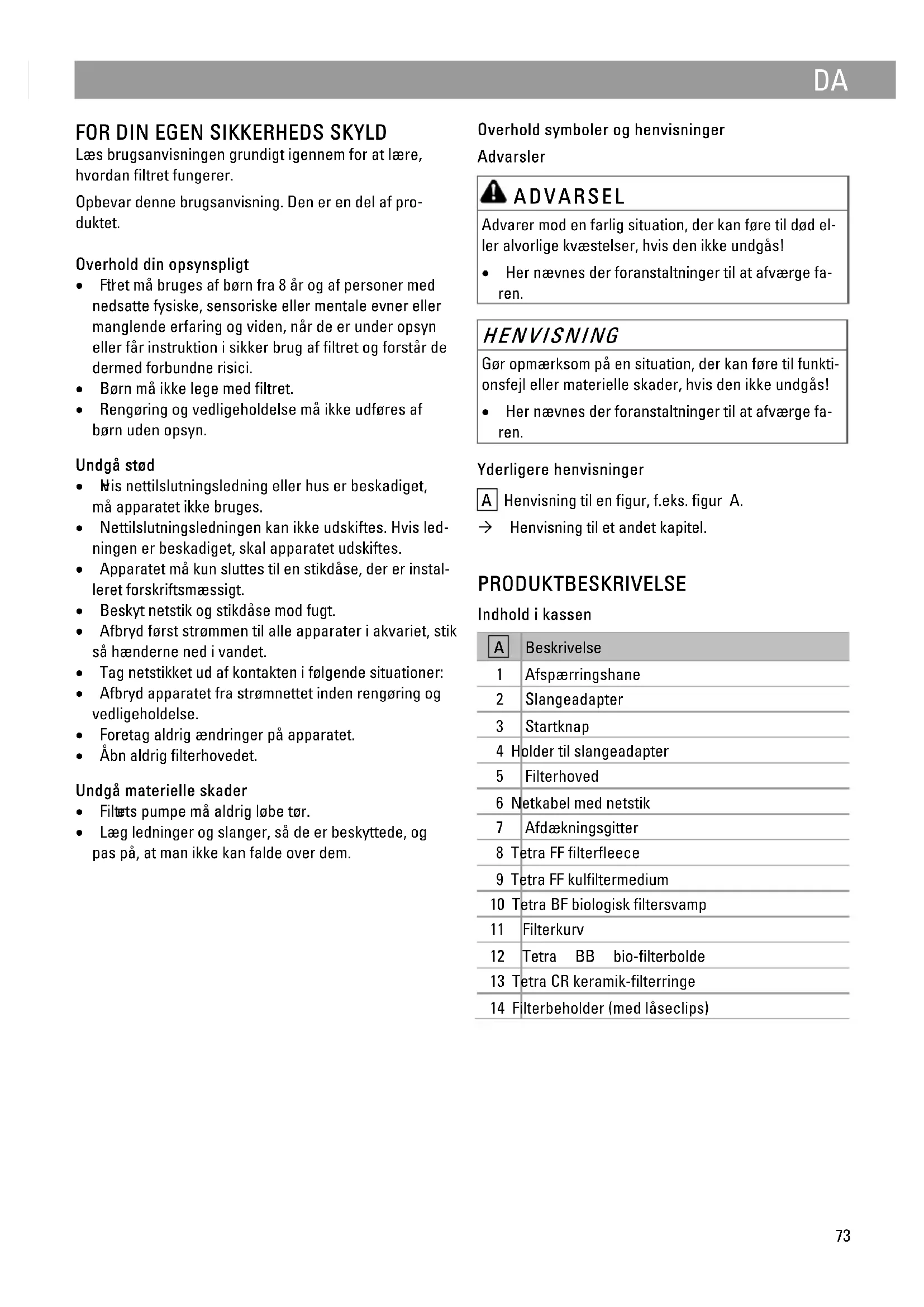 Stil filtret i det foreskrevne afstandsområde i forhold til vandniveauet i akvariet for at undgå funktionsfejl på filtret. Filter Afstand A EX 400 Plus 40 … 150 cm EX 600 Plus 50 … 150 cm EX 800 Plus 60 … 150 cm EX 1200 Plus 80 … 150 cm IBRUGTAGNING ADVARSEL Fare for elektrisk spænding! Fare for død eller alvorlige kvæstelser på grund af stød. Netstikket må kun sættes i en stikdåse, der er instal- leret forskriftsmæssigt. Stik aldrig netstikket i stikdåsen, hvis filter, slanger, netkabel eller netkabel er beskadiget. HENVISNIN