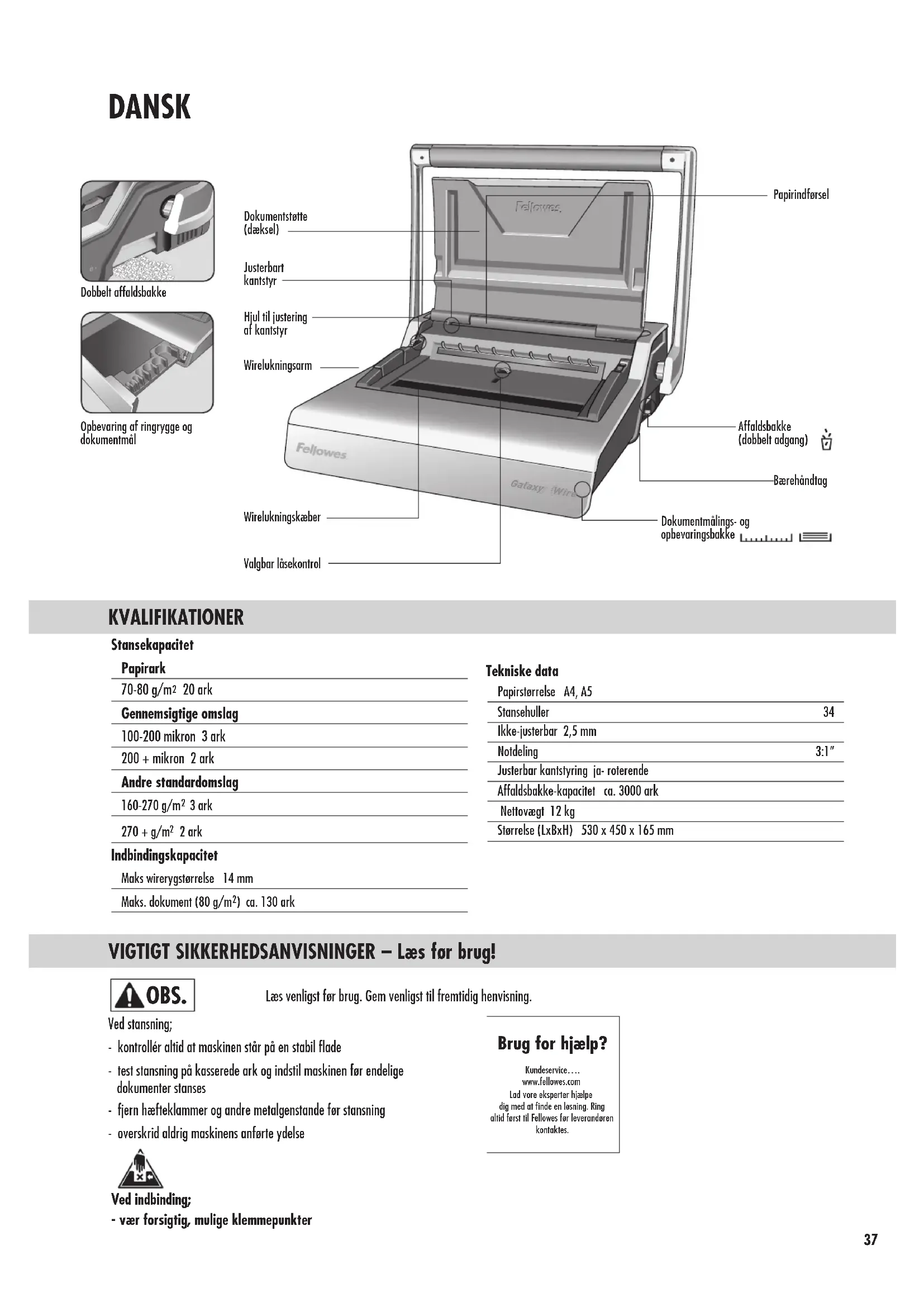 Fellowes garanterer, at alle indbindingsmaskinens dele er fri for materialedefekter og fabrikationsfejl i 2 år fra den oprindelige kundes købsdato. Hvis det konstateres, at en del er defekt under garantiperioden, vil den eneste og eksklusive afhjælpende foranstaltning være reparation eller ombytning, efter Fellowes valg og omkostning, af den defekte del. Denne garanti gælder ikke i tilfælde af overlast, misbrug eller uautoriseret reparation. Enhver underforstået garanti, inklusive salgbarhed eller egnethed til noget bestemt formål, er hermed begrænset i varighed til den pågældende garantiperiode som nævnt ovenfor. I intet tilfælde er Fellowes ansvarlig for nogen følge- eller indirekte skader, som kan henføres til dette produkt. Denne garanti giver dig specifikke juridiske rettigheder. Du kan have andre juridiske rettigheder, som afviger fra denne garanti. Varighed, betingelser og vilkår under denne garanti er gældende på verdensplan, undtagen hvor andre begrænsninger, restriktioner eller forhold kræves af den lokale lov. For yderligere detaljer eller for service under denne garanti, bedes du kontakte Fellowes eller din forhandler. FEJLFINDING Wirebinding er et sikkert indbindingssystem. Yderligere ark kan ikke tilføjes med mindre dokumentet skilles ad og indbindes på ny. Affaldsbakken er placeret under maskinen og er tilgængelig fra begge sider. Tøm bakken regelmæssigt for at opnå det bedste resultat. Bakken skal tømmes efter hver 50 indbindinger for at sikre imod tilstopning. OPBEVARING Sænk dækslet. Galaxy wirerygsindbindere er beregnet til horisontal opbevaring på en bordflade. Problem Kan ikke lukke wireryggen tæt nok Hulkanterne er beskadiget Affaldsbakken er utæt Stansehuller er ikke centrerede Maskinen vil ikke stanse Stansehuller er ikke parallelle med kanten Delvise hulkanter Ark falder ud af dokumentet Årsag Wirelukningskæberne er indstillet til en for stor diameter Mulig overbelastning af maskinen Affaldsbakken er ikke korrekt monteret eller ‘brist-funktionen’er aktiveret Kantstyr ikke indstillet Blokering Der sidder papirrester under stansehovederne Arkene er ikke tilpasset korrekt til stansemønstret. Wireryggen er ikke lukket tilstrækkeligt Løsning Juster lukkekontrollen til en mindre diameter efter behov Stans plastomslag med papirark. Reducér antallet af ark, der stanses Kontrollér at affaldsbakken er tom, og‘brist-funktionen’er lukket Justér kantstyret indtil hulmønstret er korrekt Kontrollér at affaldsbakken er tom. Kontrollér om der er blokering ved papirindførsel Før stift karton ind i papirindførslen. Bevæg kartonen sidelæns for at frigøre rester, så de kommer i affaldsbakken Justér kantstyret og test stansning på kasserede ark, indtil hullerne er korrekte Efterse lukningen på wireryggen. Placer i lukkemekanismen og gør bindingslukningen bedre. Juster lukkekontrollen til en mindre diameter efter behov