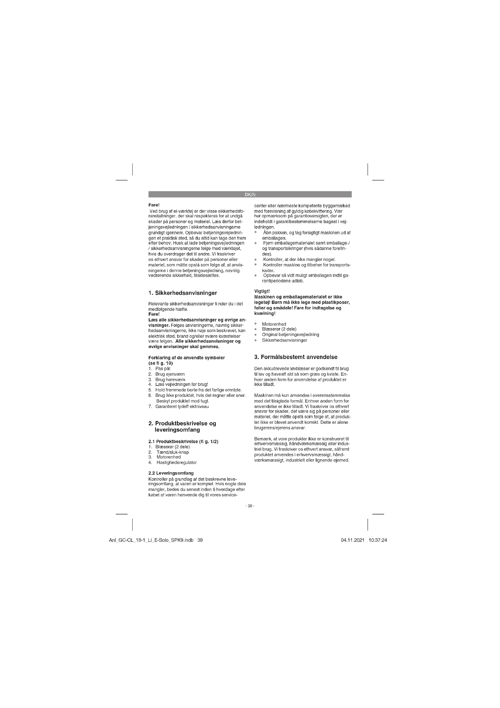 Den akkudrevede løvblæser er godkendt til brug til løv og haveaff ald så som græs og kviste. En- hver anden form for anvendelse af produktet er ikke tilladt. Maskinen må kun anvendes i overensstemmelse med det tilsigtede formål. Enhver anden form for anvendelse er ikke tilladt. Vi fraskriver os ethvert ansvar for skader, det være sig på personer eller materiel, der måtte opstå som følge af, at produk- tet ikke er blevet anvendt korrekt. Dette er alene brugerens/ejerens ansvar. Bemærk, at vore produkter ikke er konstrueret til erhvervsmæssig, håndværksmæssig eller indus- triel brug. Vi fraskriver os ethvert ansvar, såfremt produktet anvendes i erhvervsmæssigt, hånd- værksmæssigt, industrielt eller lignende øjemed. Anl_GC-CL_18-1_Li_E-Solo_SPK9.indb 39Anl_GC-CL_18-1_Li_E-Solo_SPK9.indb 39 04.11.2021 10:37:2404.11.2021 10:37:24DK/N