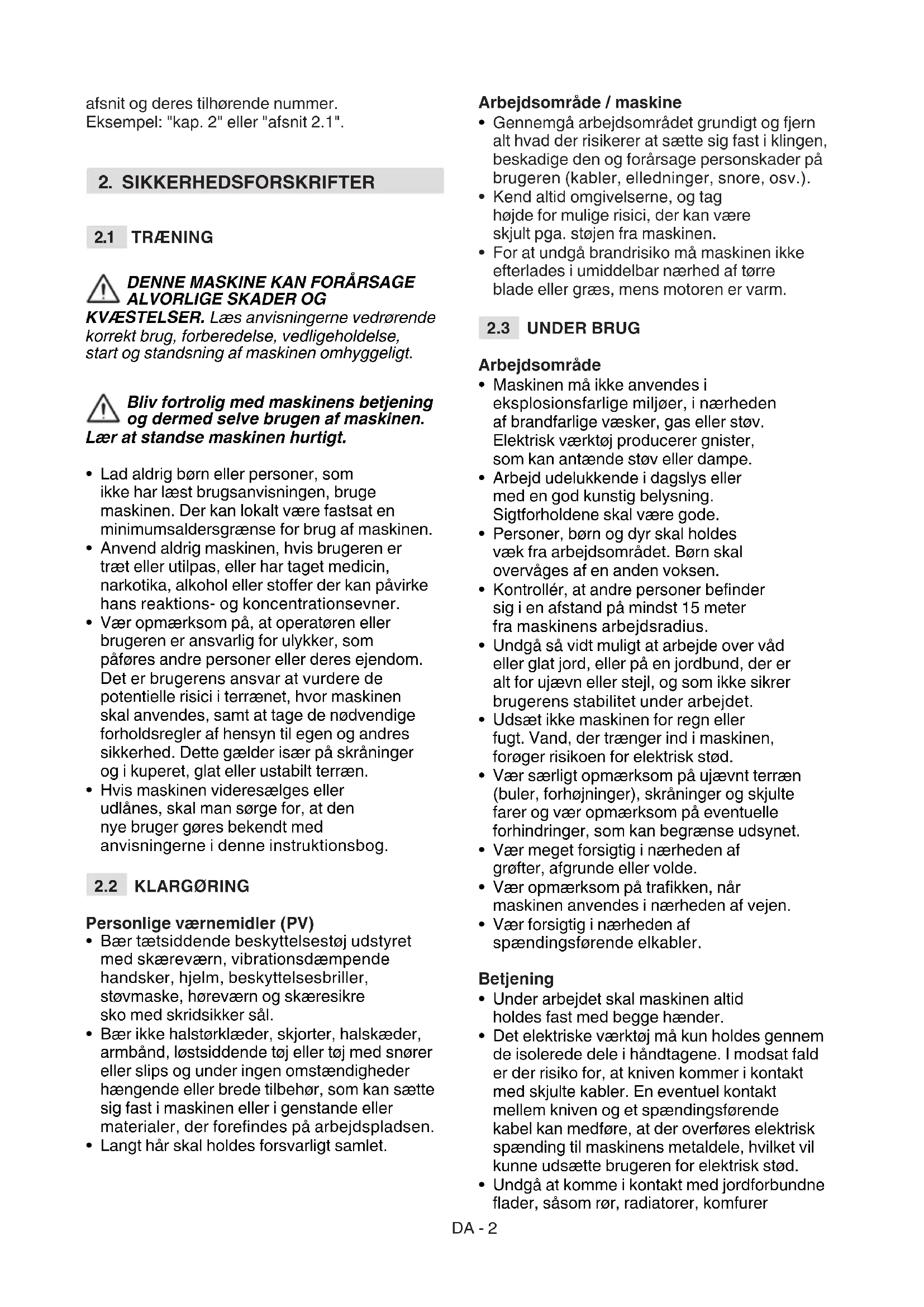 FARE FOR UDSLYNGNING! Når maskinen er i brug, skal samtlige personer og/eller husdyr holdes i en afstand på mindst 15 m fra maskinen!. Risiko for skæring! Hold hænder og fødder væk fra knivene. Klasse II Dobbelt isolering VIGTIGT Hvis mærkaterne er blevet ødelagt eller er ulæselige, bør de udskiftes. Ret henvendelse til dit autoriserede servicecenter for at få udleveret nye mærkater.