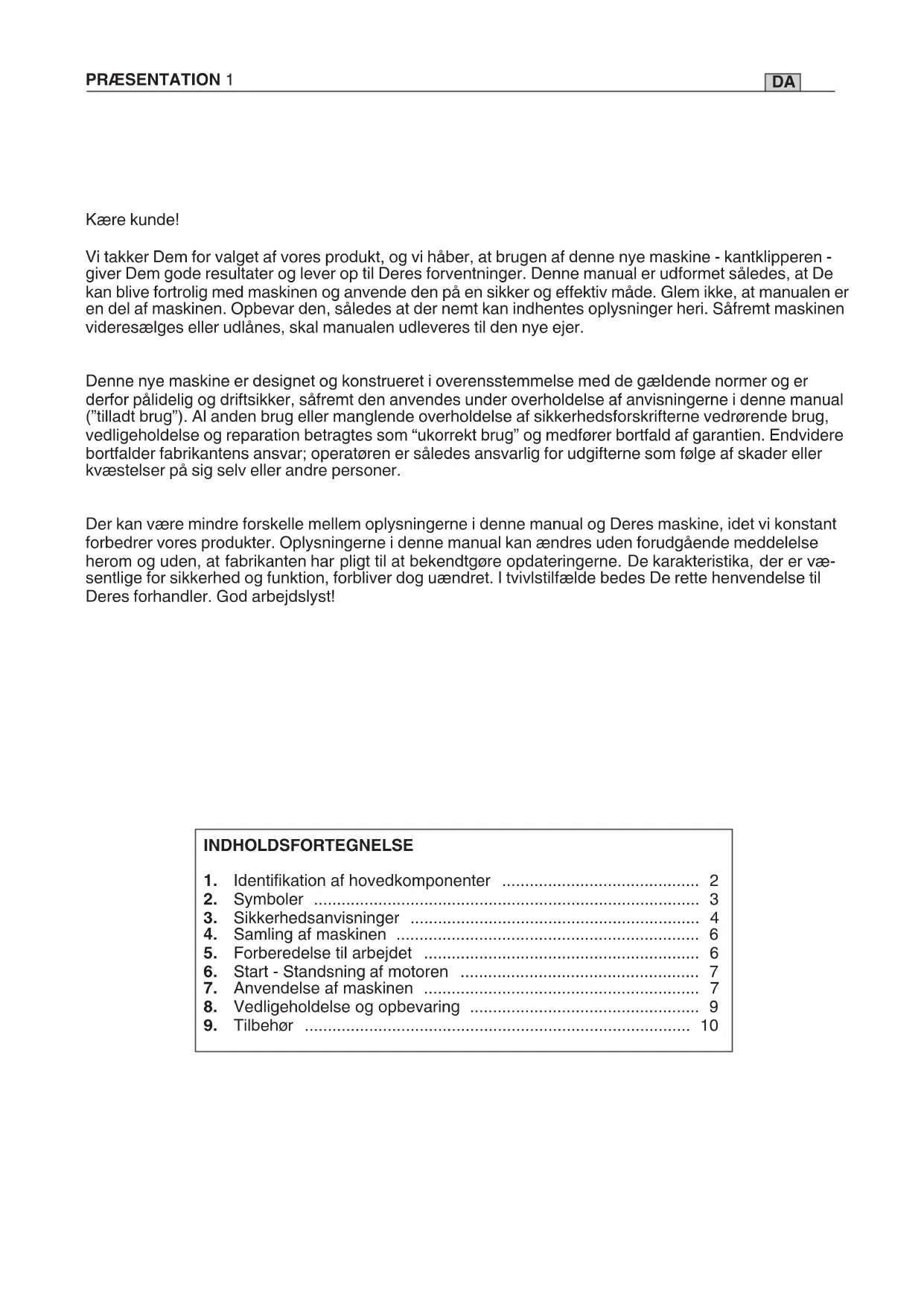 Kód Model T 1.0 EJ 118801750/0 (M8 x 1,25 dx M)DA PRÆSENTATION 1 Kære kunde! Vi takker Dem for valget af vores produkt, og vi håber, at brugen af denne nye maskine - kantklipperen - giver Dem gode resultater og lever op til Deres forventninger. Denne manual er udformet således, at De kan blive fortrolig med maskinen og anvende den på en sikker og eektiv måde. Glem ikke, at manualen er en del af maskinen. Opbevar den, således at der nemt kan indhentes oplysninger heri. Såfremt maskinen videresælges eller udlånes, skal manualen udleveres til den nye ejer. Denne nye maskine er designet og konstrueret i overensstemmelse med de gældende normer og er derfor pålidelig og driftsikker, såfremt den anvendes under overholdelse af anvisningerne i denne manual (”tilladt brug”). Al anden brug eller manglende overholdelse af sikkerhedsforskrifterne vedrørende brug, vedligeholdelse og reparation betragtes som “ukorrekt brug” og medfører bortfald af garantien. Endvidere bortfalder fabrikantens ansvar; operatøren er således ansvarlig for udgifterne som følge af skader eller kvæstelser på sig selv eller andre personer. Der kan være mindre forskelle mellem oplysningerne i denne manual og Deres maskine, idet vi konstant forbedrer vores produkter. Oplysningerne i denne manual kan ændres uden forudgående meddelelse herom og uden, at fabrikanten har pligt til at bekendtgøre opdateringerne. De karakteristika, der er væ- sentlige for sikkerhed og funktion, forbliver dog uændret. I tvivlstilfælde bedes De rette henvendelse til Deres forhandler. God arbejdslyst! INDHOLDSFORTEGNELSE