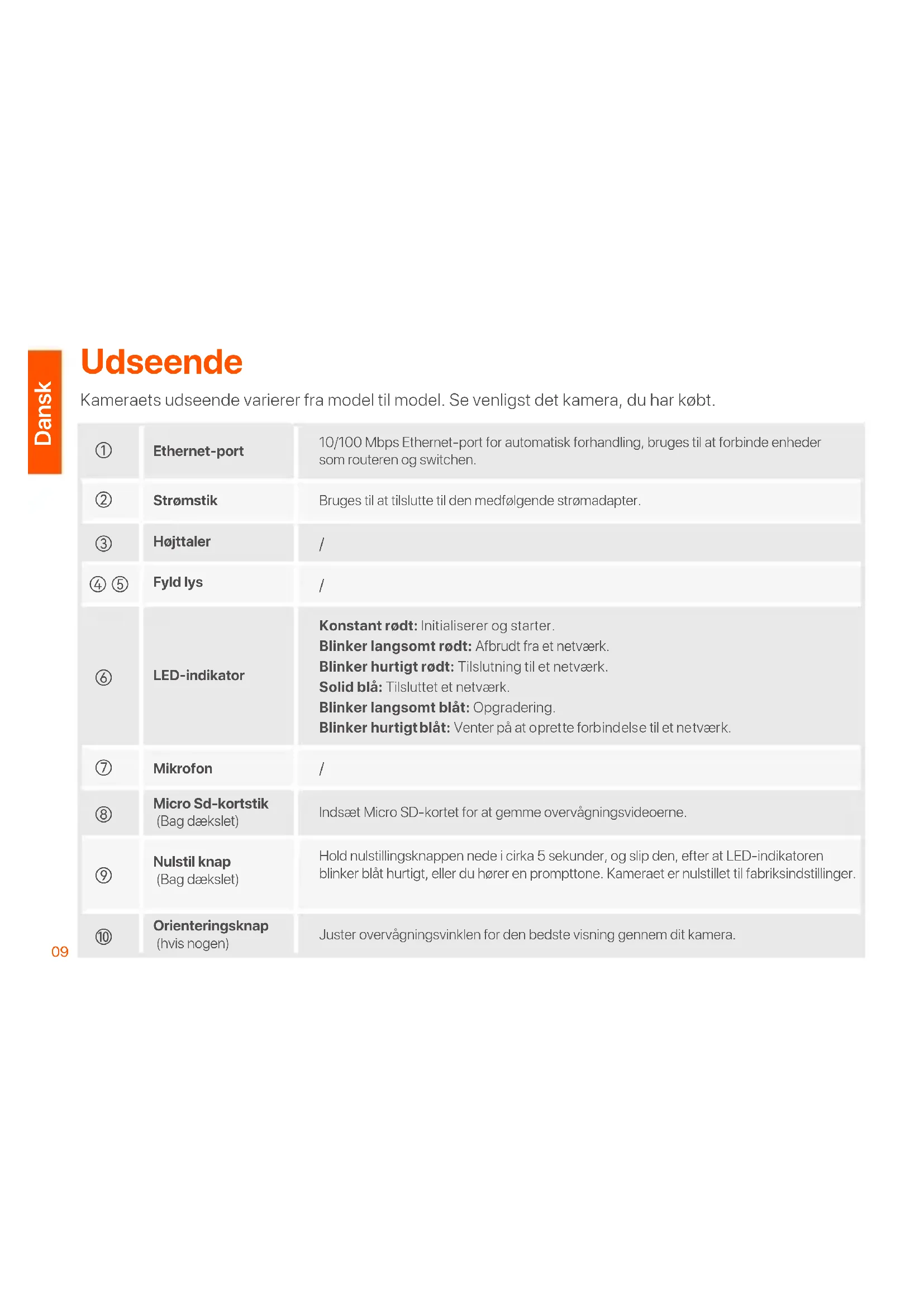 Bruges til at tilslutte til den medfølgende strømadapter. 10/100 Mbps Ethernet-port for automatisk forhandling, bruges til at forbinde enheder som routeren og switchen. Konstant rødt: Initialiserer og starter. Blinker langsomt rødt: Afbrudt fra et netværk. Blinker hurtigt rødt: Tilslutning til et netværk. Solid blå: Tilsluttet et netværk. Blinker langsomt blåt: Opgradering. Blinker hurtigt blåt: Venter på at oprette forbindelse til et netværk. Indsæt Micro SD-kortet for at gemme overvågningsvideoerne. Hold nulstillingsknappen nede i cirka 5 sekunder, og slip den, efter at LED-indikatoren blinker blåt hurtigt, eller du hører en prompttone. Kameraet er nulstillet til fabriksindstillinger. Juster overvågningsvinklen for den bedste visning gennem dit kamera. Fyld lys LED-indikator Mikrofon Højttaler