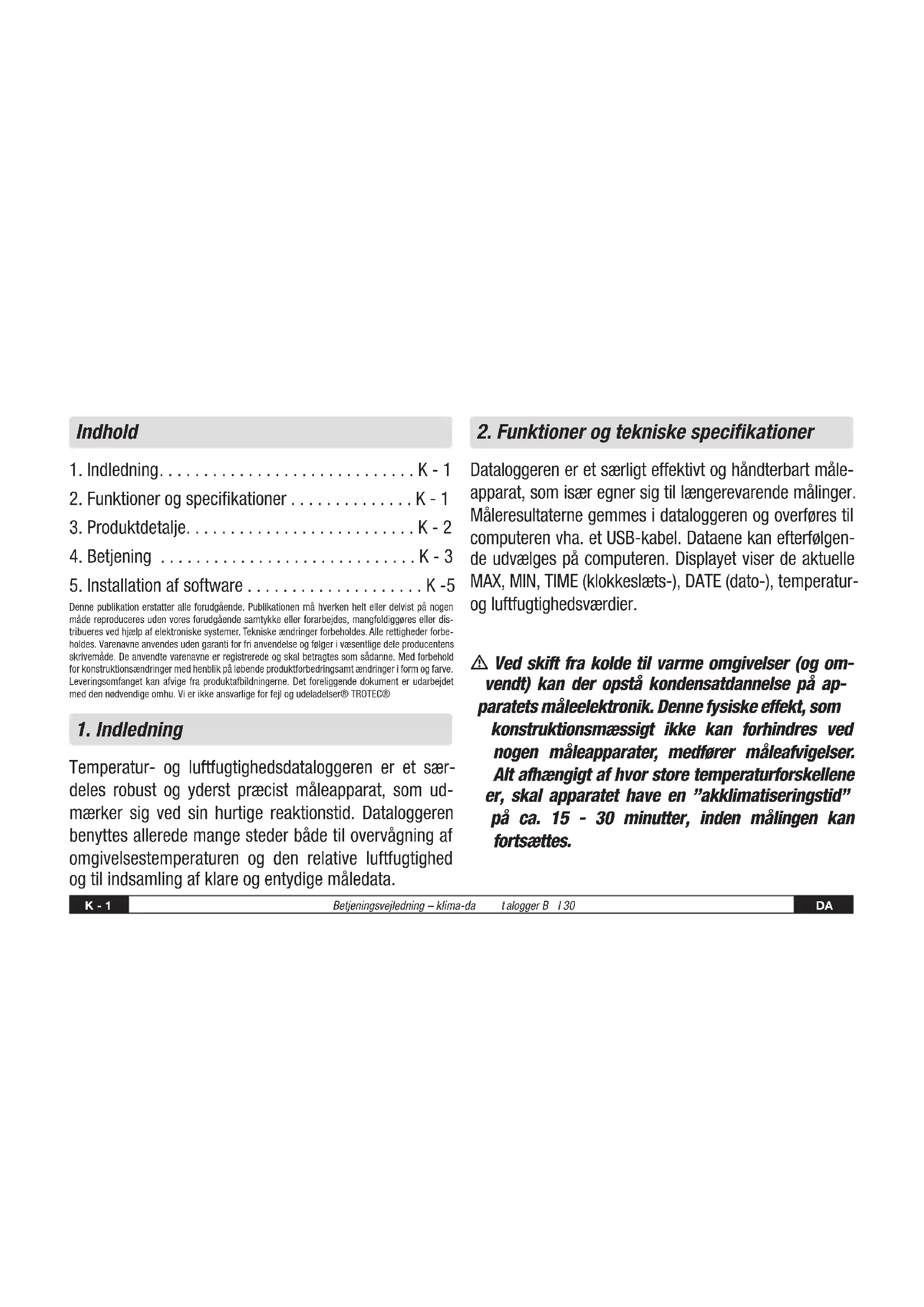 Dataloggeren er et særligt effektivt og håndterbart måle- apparat, som især egner sig til længerevarende målinger. Måleresultaterne gemmes i dataloggeren og overføres til computeren vha. et USB-kabel. Dataene kan efterfølgen- de udvælges på computeren. Displayet viser de aktuelle MAX, MIN, TIME (klokkeslæts-), DATE (dato-), temperatur- og luftfugtighedsværdier. m Ved skift fra kolde til varme omgivelser (og om- vendt) kan der opstå kondensatdannelse på ap- paratets måleelektronik. Denne fysiske effekt, som konstruktionsmæssigt ikke kan forhindres ved nogen måleapparater, medfører måleafvigelser. Alt afhængigt af hvor store temperaturforskellene er, skal apparatet have en ”akklimatiseringstid” på ca. 15 - 30 minutter, inden målingen kan fortsættes. TRO-TR-BA-BL30-HS-002-INT - Kopie.indd 1 08.09.2014 10:20:00DA Betjeningsvejledning – klima-da t alogger B l 30 K - 2 m Sørg for, at dataloggeren altid placeres/lagres lodret. Dette gælder også efter målinger, som er fo- retaget ved lave temperaturer eller i omgivelser med høj luftfugtighed. Dette skal forhindre, at evt. opstået kondensvand samler sig i apparatet og i stedet kan sive ud af den nedre del af apparatet. Vent, til eventuel fugtighed, som kan opstå ved en fysisk proces inde i apparatet, er helt fordampet, før de indsamlede data udvælges til analyse. For at skåne batterierne kan dataloggeren også slut- tes direkte til computeren via USB. Med denne for bindelse trækkes energien direkte fra computeren.