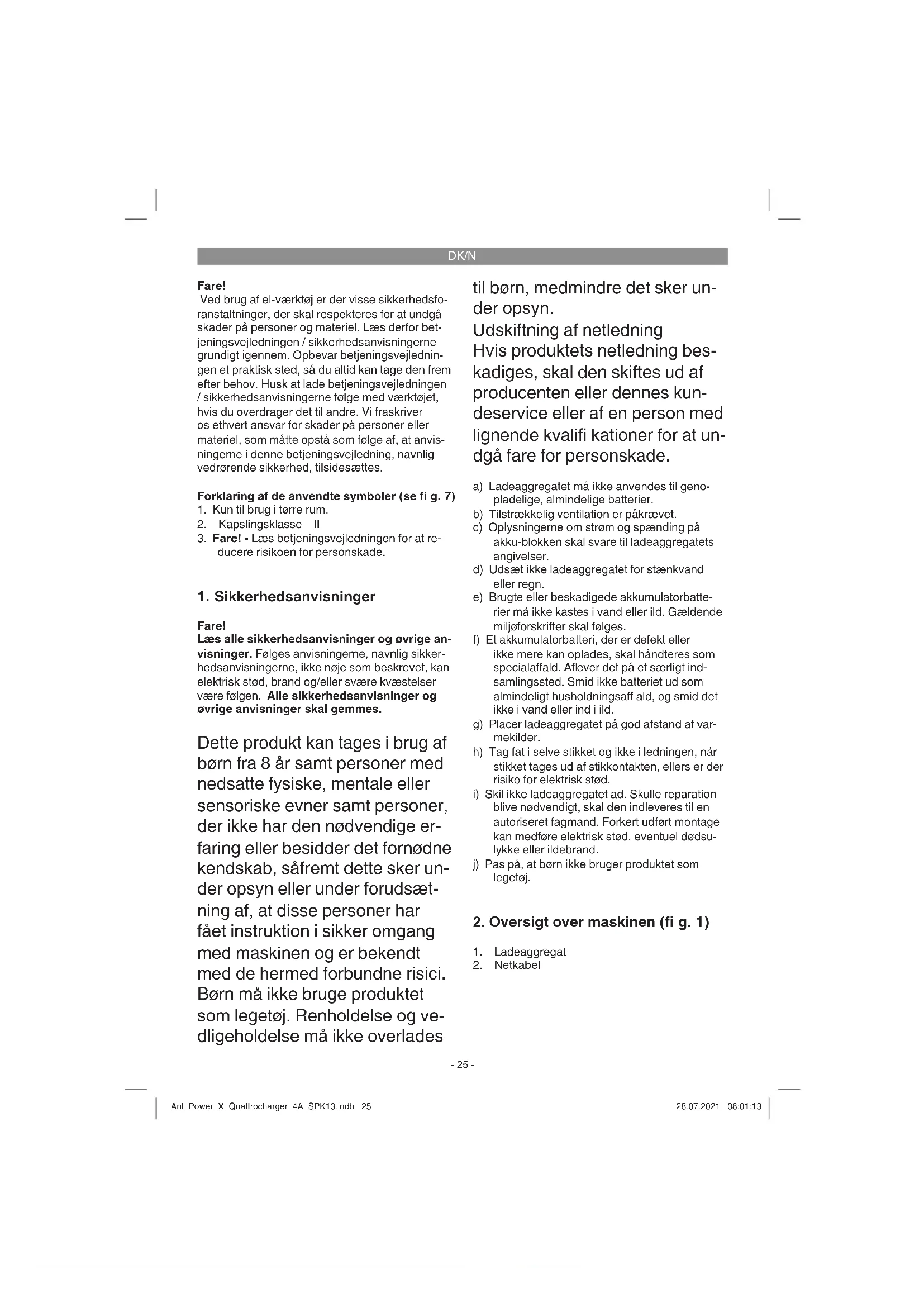 Fare! Læs alle sikkerhedsanvisninger og øvrige an- visninger. Følges anvisningerne, navnlig sikker- hedsanvisningerne, ikke nøje som beskrevet, kan elektrisk stød, brand og/eller svære kvæstelser være følgen. Alle sikkerhedsanvisninger og øvrige anvisninger skal gemmes. Dette produkt kan tages i brug af børn fra 8 år samt personer med nedsatte fysiske, mentale eller sensoriske evner samt personer, der ikke har den nødvendige er- faring eller besidder det fornødne kendskab, såfremt dette sker un- der opsyn eller under forudsæt- ning af, at disse personer har fået instruktion i sikker omgang med maskinen og er bekendt med de hermed forbundne risici. Børn må ikke bruge produktet som legetøj. Renholdelse og ve- dligeholdelse må ikke overlades til børn, medmindre det sker un- der opsyn. Udskiftning af netledning Hvis produktets netledning bes- kadiges, skal den skiftes ud af producenten eller dennes kun- deservice eller af en person med lignende kvalifi kationer for at un- dgå fare for personskade. a) Ladeaggregatet må ikke anvendes til geno- pladelige, almindelige batterier. b) Tilstrækkelig ventilation er påkrævet. c) Oplysningerne om strøm og spænding på akku-blokken skal svare til ladeaggregatets angivelser. d) Udsæt ikke ladeaggregatet for stænkvand eller regn. e) Brugte eller beskadigede akkumulatorbatte- rier må ikke kastes i vand eller ild. Gældende miljøforskrifter skal følges. f) Et akkumulatorbatteri, der er defekt eller ikke mere kan oplades, skal håndteres som specialaff ald. Afl ever det på et særligt ind- samlingssted. Smid ikke batteriet ud som almindeligt husholdningsaff ald, og smid det ikke i vand eller ind i ild. g) Placer ladeaggregatet på god afstand af var- mekilder. h) Tag fat i selve stikket og ikke i ledningen, når stikket tages ud af stikkontakten, ellers er der risiko for elektrisk stød.