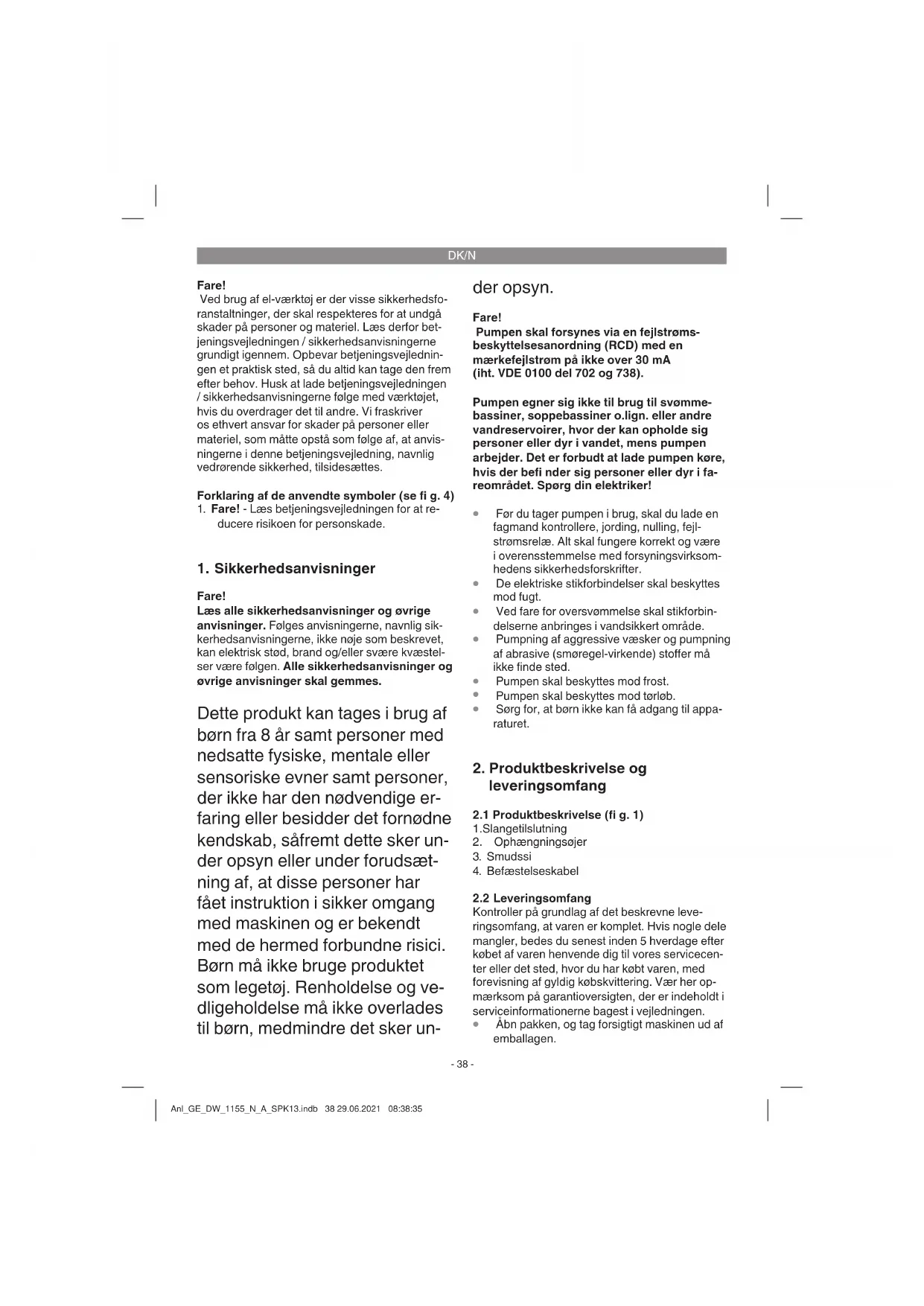 Fare! Læs alle sikkerhedsanvisninger og øvrige anvisninger. Følges anvisningerne, navnlig sik- kerhedsanvisningerne, ikke nøje som beskrevet, kan elektrisk stød, brand og/eller svære kvæstel- ser være følgen. Alle sikkerhedsanvisninger og øvrige anvisninger skal gemmes. Dette produkt kan tages i brug af børn fra 8 år samt personer med nedsatte fysiske, mentale eller sensoriske evner samt personer, der ikke har den nødvendige er- faring eller besidder det fornødne kendskab, såfremt dette sker un- der opsyn eller under forudsæt- ning af, at disse personer har fået instruktion i sikker omgang med maskinen og er bekendt med de hermed forbundne risici. Børn må ikke bruge produktet som legetøj. Renholdelse og ve- dligeholdelse må ikke overlades til børn, medmindre det sker un- der opsyn. Fare! Pumpen skal forsynes via en fejlstrøms- beskyttelsesanordning (RCD) med en mærkefejlstrøm på ikke over 30 mA (iht. VDE 0100 del 702 og 738). Pumpen egner sig ikke til brug til svømme- bassiner, soppebassiner o.lign. eller andre vandreservoirer, hvor der kan opholde sig personer eller dyr i vandet, mens pumpen arbejder. Det er forbudt at lade pumpen køre, hvis der befi nder sig personer eller dyr i fa- reområdet. Spørg din elektriker!