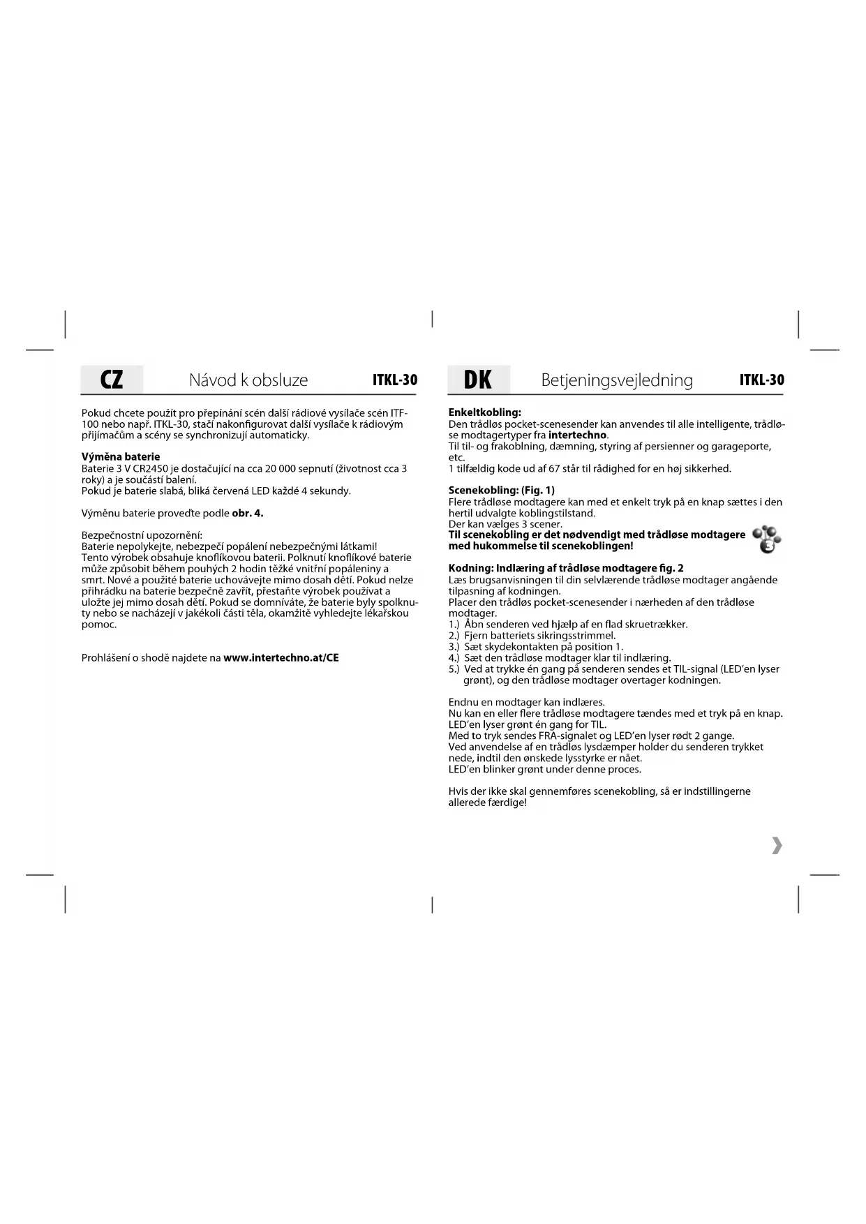 Návod k obsluze ITKL-30 Enkeltkobling:Den trådløs pocket-scenesender kan anvendes til alle intelligente, trådlø-se modtagertyper fra intertechno.Til til- og frakoblning, dæmning, styring af persienner og garageporte, etc. 1 tilfældig kode ud af 67 står til rådighed for en høj sikkerhed. Scenekobling: (Fig. 1)Flere trådløse modtagere kan med et enkelt tryk på en knap sættes i den hertil udvalgte koblingstilstand.Der kan vælges 3 scener. Til scenekobling er det nødvendigt med trådløse modtagere med hukommelse til scenekoblingen!Kodning: Indlæring af trådløse modtagere fig. 2Læs brugsanvisningen til din selvlærende trådløse modtager angående tilpasning af kodningen.Placer den trådløs pocket-scenesender i nærheden af den trådløse modtager.1.) Åbn senderen ved hjælp af en flad skruetrækker. 2.) Fjern batteriets sikringsstrimmel.3.) Sæt skydekontakten på position 1.4.) Sæt den trådløse modtager klar til indlæring.5.) Ved at trykke én gang på senderen sendes et TIL-signal (LED’en lyser grønt), og den trådløse modtager overtager kodningen.Endnu en modtager kan indlæres.Nu kan en eller flere trådløse modtagere tændes med et tryk på en knap. LED’en lyser grønt én gang for TIL. Med to tryk sendes FRA-signalet og LED’en lyser rødt 2 gange.Ved anvendelse af en trådløs lysdæmper holder du senderen trykket nede, indtil den ønskede lysstyrke er nået. LED’en blinker grønt under denne proces.Hvis der ikke skal gennemføres scenekobling, så er indstillingerne allerede færdige!