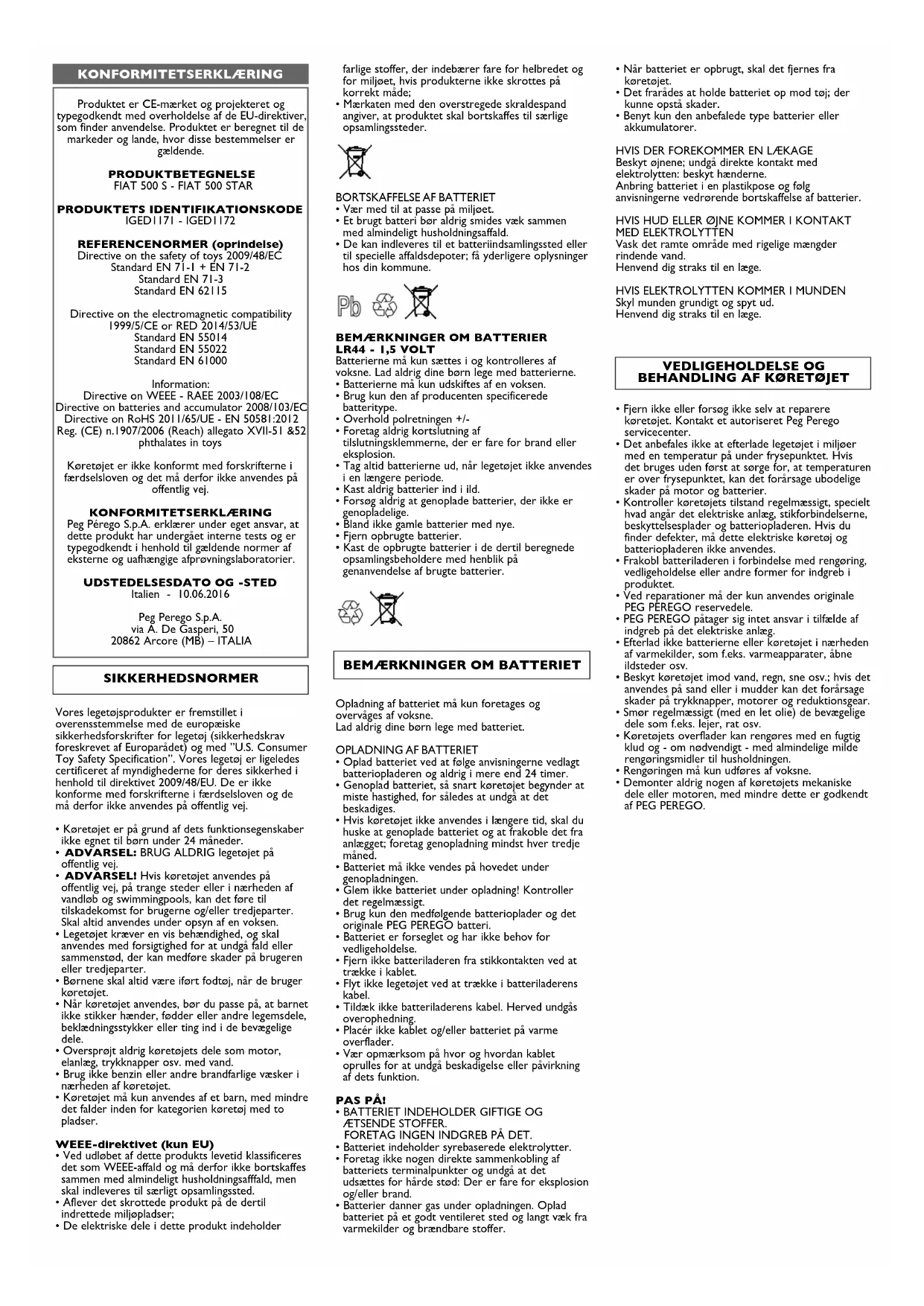 Italien - 10.06.2016 Peg Perego S.p.A. via A. De Gasperi, 50 20862 Arcore (MB) – ITALIA KONFORMITETSERKLÆRING Vores legetøjsprodukter er fremstillet i overensstemmelse med de europæiske sikkerhedsforskrifter for legetøj (sikkerhedskrav foreskrevet af Europarådet) og med ”U.S. Consumer Toy Safety Specification”. Vores legetøj er ligeledes certificeret af myndighederne for deres sikkerhed i henhold til direktivet 2009/48/EU. De er ikke konforme med forskrifterne i færdselsloven og de må derfor ikke anvendes på offentlig vej.