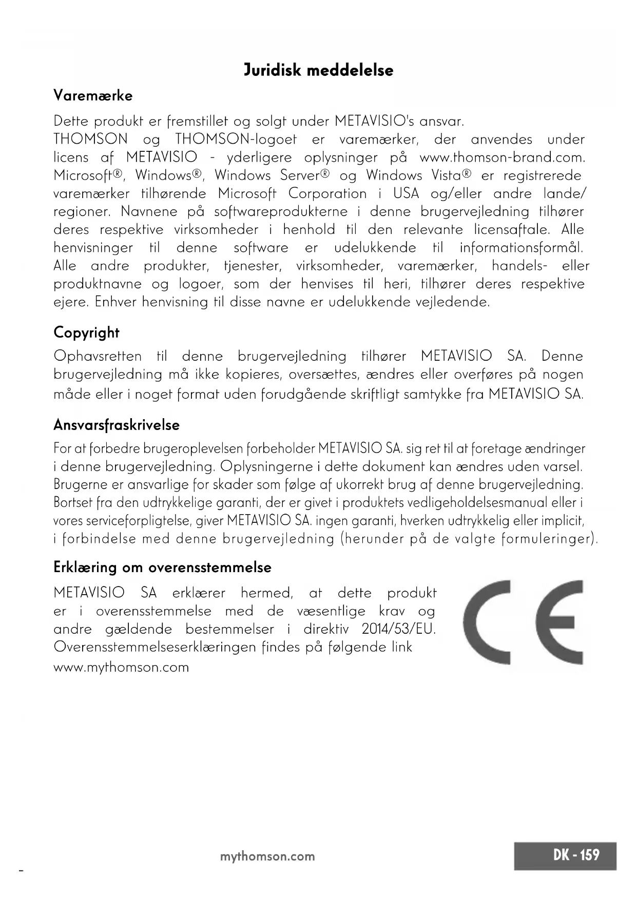 mythomson.com Juridisk meddelelse Varemærke Dette produkt er fremstillet og solgt under METAVISIO's ansvar. THOMSON og THOMSON-logoet er varemærker, der anvendes under licens af METAVISIO - yderligere oplysninger på www.thomson-brand.com. Microsoft®, Windows®, Windows Server® og Windows Vista® er registrerede varemærker tilhørende Microsoft Corporation i USA og/eller andre lande/ regioner. Navnene på softwareprodukterne i denne brugervejledning tilhører deres respektive virksomheder i henhold til den relevante licensaftale. Alle henvisninger til denne software er udelukkende til informationsformål. Alle andre produkter, tjenester, virksomheder, varemærker, handels- eller produktnavne og logoer, som der henvises til heri, tilhører deres respektive ejere. Enhver henvisning til disse navne er udelukkende vejledende. Copyright Ophavsretten til denne brugervejledning tilhører METAVISIO SA. Denne brugervejledning må ikke kopieres, oversættes, ændres eller overføres på nogen måde eller i noget format uden forudgående skriftligt samtykke fra METAVISIO SA. Ansvarsfraskrivelse For at forbedre brugeroplevelsen forbeholder METAVISIO SA. sig ret til at foretage ændringer i denne brugervejledning. Oplysningerne i dette dokument kan ændres uden varsel. Brugerne er ansvarlige for skader som følge af ukorrekt brug af denne brugervejledning. Bortset fra den udtrykkelige garanti, der er givet i produktets vedligeholdelsesmanual eller i vores serviceforpligtelse, giver METAVISIO SA. ingen garanti, hverken udtrykkelig eller implicit, i forbindelse med denne brugervejledning (herunder på de valgte formuleringer). Erklæring om overensstemmelse METAVISIO SA erklærer hermed, at dette produkt er i overensstemmelse med de væsentlige krav og andre gældende bestemmelser i direktiv 2014/53/EU. Overensstemmelseserklæringen ndes på følgende link www.mythomson.com160 - DK Brugervejledning - NEO - 17.3’’ mythomson.com - Vigtige sikkerhedsanvisninger - Denne enhed skal bruges i et miljø, hvor den omgivende temperatur er mellem 5 °C (41 °F) og 35 °C (95 °F). Udsæt ikke enheden for regn eller fugt, og hold den væk fra væsker. Hvis der spildes vand eller andre væsker på apparatet, skal du straks slukke for strømmen og vente, indtil apparatet er helt tørt, før du tænder det igen. Udsæt ikke enheden for direkte sollys. Brug ikke stærke opløsningsmidler, ydende rengøringsmidler eller andre kemikalier på eller i nærheden af enhedens overade for at undgå korrosion eller skader på enhedens overade. Udsæt ikke enheden for støvede omgivelser. Brug ikke apparatet under en gaslækage. Udsæt ikke enheden for stærke magnetiske eller elektriske felter. Du kan lade enheden passere gennem lufthavnens røntgendetektorer. Det anbefales dog, at du ikke fører din enhed gennem magnetiske detektionsportaler eller udsætter den for håndholdte detektorer. Der må ikke placeres genstande på enheden. Placer ikke enheden på et ujævnt eller ustabilt underlag. Sørg for at beskytte enheden mod at falde ned eller på anden måde blive beskadiget. Lad ikke enheden være tændt eller opladet på dit skød eller andre dele af kroppen for at undgå varmerelaterede skader. Sluk for apparatet, før du transporterer det eller dækker det med et materiale, der ikke giver optimal luftcirkulation. Brug ikke beskadigede netkabler, tilbehør eller andre enheder sammen med enheden. Vi anbefaler, at du kun bruger det tilbehør (strømforsyning, kabler osv.), der leveres sammen med enheden. Brug kun originale batterier. Udskiftning af batteriet med et forkert batteri kan medføre risiko for eksplosionDK - 161 mythomson.com Du må ikke selv adskille, ændre eller reparere enheden, da dette kan medføre, at garantien bortfalder. Du bedes sikkerhedskopiere dit vigtige indhold regelmæssigt for at undgå tab af data. Vores virksomhed påtager sig intet ansvar for tab eller sletning af elementer, der er indeholdt i enheden som følge af forkert brug af hardware eller software, manglende vedligeholdelse eller andre utilsigtede hændelser. Dette produkt er designet til at muliggøre korrekt genbrug af dele og komponenter. Symbolet med den overstregede skraldespand på hjul angiver, at apparatet ikke må bortskaffes sammen med husholdningsaffald. Se de lokale regler for bortskaffelse af elektronisk udstyr. Symbolet med den overstregede skraldespand på hjul angiver, at batteriet ikke må bortskaffes med det kommunale affald. Se de lokale regler for bortskaffelse af batterier. For at undgå mulige høreskader må du ikke lytte til høje niveauer i længere tid.162 - DK Brugervejledning - NEO - 17.3’’ mythomson.comDK - 163 mythomson.com164 - DK Brugervejledning - NEO - 17.3’’ mythomson.com - Tænding - Bemærk : Oplad din Thomson-enhed, før du bruger den første gang. Opladning af batteriet på din enhed Tilslut vekselstrømsadapteren til en jordet stikkontakt. ADVARSEL : Læs følgende vejledning om batteriet i din THOMSON-enhed omhyggeligt :