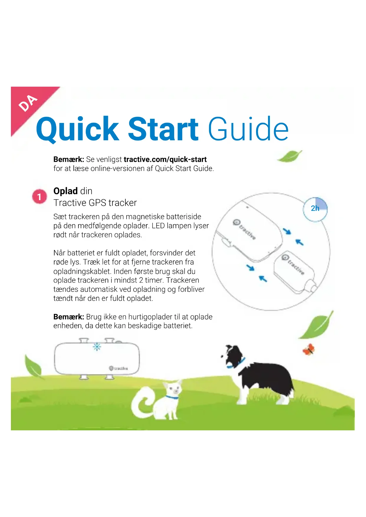 Bemærk: Se venligst tractive.com/quick-start for at læse online-versionen af Quick Start Guide. Oplad din Tractive GPS tracker Sæt trackeren på den magnetiske batteriside på den medfølgende oplader. LED lampen lyser rødt når trackeren oplades. Når batteriet er fuldt opladet, forsvinder det røde lys. Træk let for at fjerne trackeren fra opladningskablet. Inden første brug skal du oplade trackeren i mindst 2 timer. Trackeren tændes automatisk ved opladning og forbliver tændt når den er fuldt opladet. Bemærk: Brug ikke en hurtigoplader til at oplade enheden, da dette kan beskadige batteriet.2