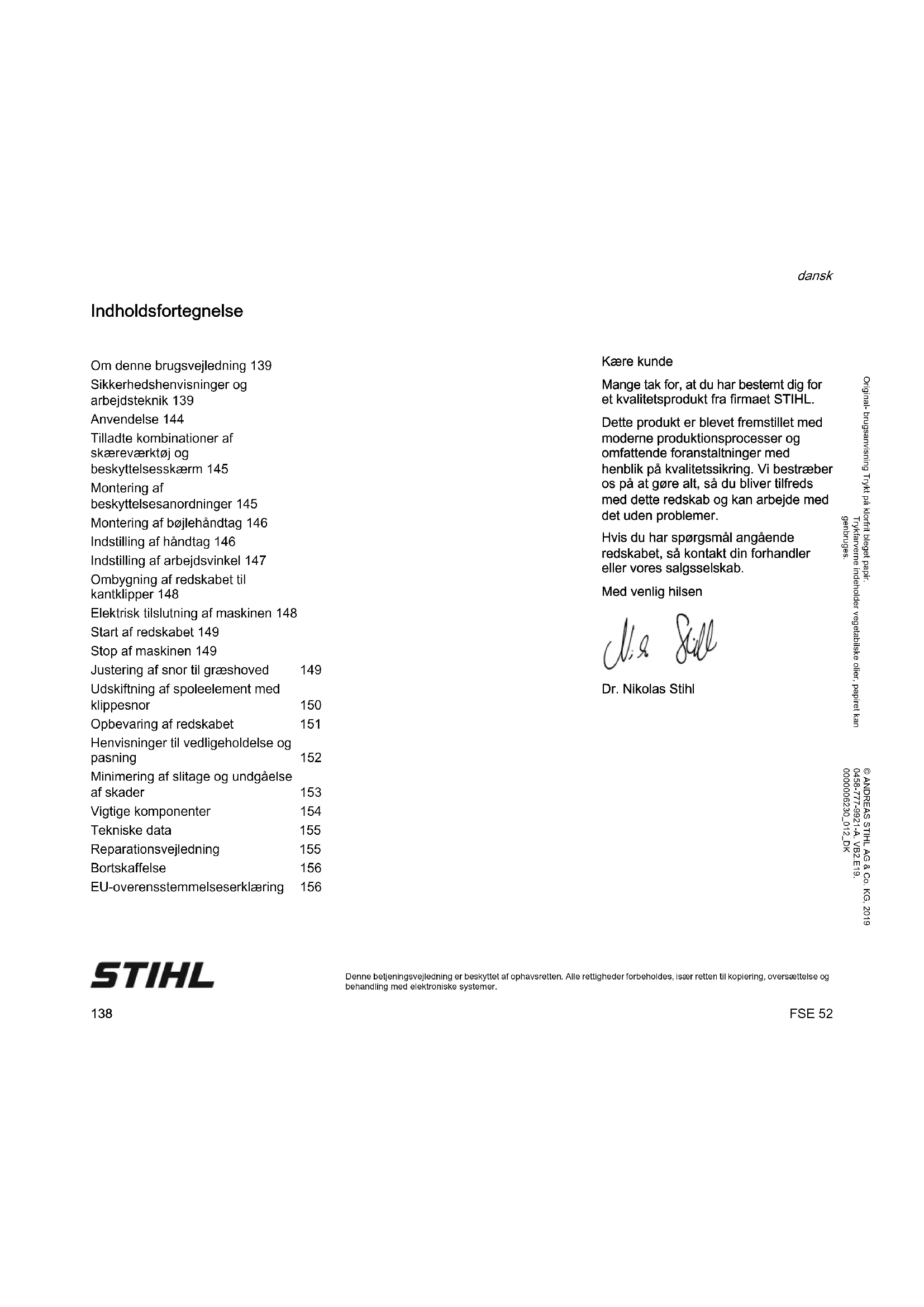 Denne betjeningsvejledning er beskyttet af ophavsretten. Alle rettigheder forbeholdes, især retten til kopiering, oversættelse og behandling med elektroniske systemer. Indholdsfortegnelse Kære kunde Mange tak for, at du har bestemt dig for et kvalitetsprodukt fra firmaet STIHL. Dette produkt er blevet fremstillet med moderne produktionsprocesser og omfattende foranstaltninger med henblik på kvalitetssikring. Vi bestræber os på at gøre alt, så du bliver tilfreds med dette redskab og kan arbejde med det uden problemer. Hvis du har spørgsmål angående redskabet, så kontakt din forhandler eller vores salgsselskab. Med venlig hilsen Dr. Nikolas Stihl Om denne brugsvejledning 139 Sikkerhedshenvisninger og arbejdsteknik 139 Anvendelse 144 Tilladte kombinationer af skæreværktøj og beskyttelsesskærm 145 Montering af beskyttelsesanordninger 145 Montering af bøjlehåndtag 146 Indstilling af håndtag 146 Indstilling af arbejdsvinkel 147 Ombygning af redskabet til kantklipper 148 Elektrisk tilslutning af maskinen 148 Start af redskabet 149 Stop af maskinen 149 Justering af snor til græshoved 149 Udskiftning af spoleelement med klippesnor 150 Opbevaring af redskabet 151 Henvisninger til vedligeholdelse og pasning 152 Minimering af slitage og undgåelse af skader 153 Vigtige komponenter 154 Tekniske data 155 Reparationsvejledning 155 Bortskaffelse 156 EU-overensstemmelseserklæring 156FSE 52 dansk