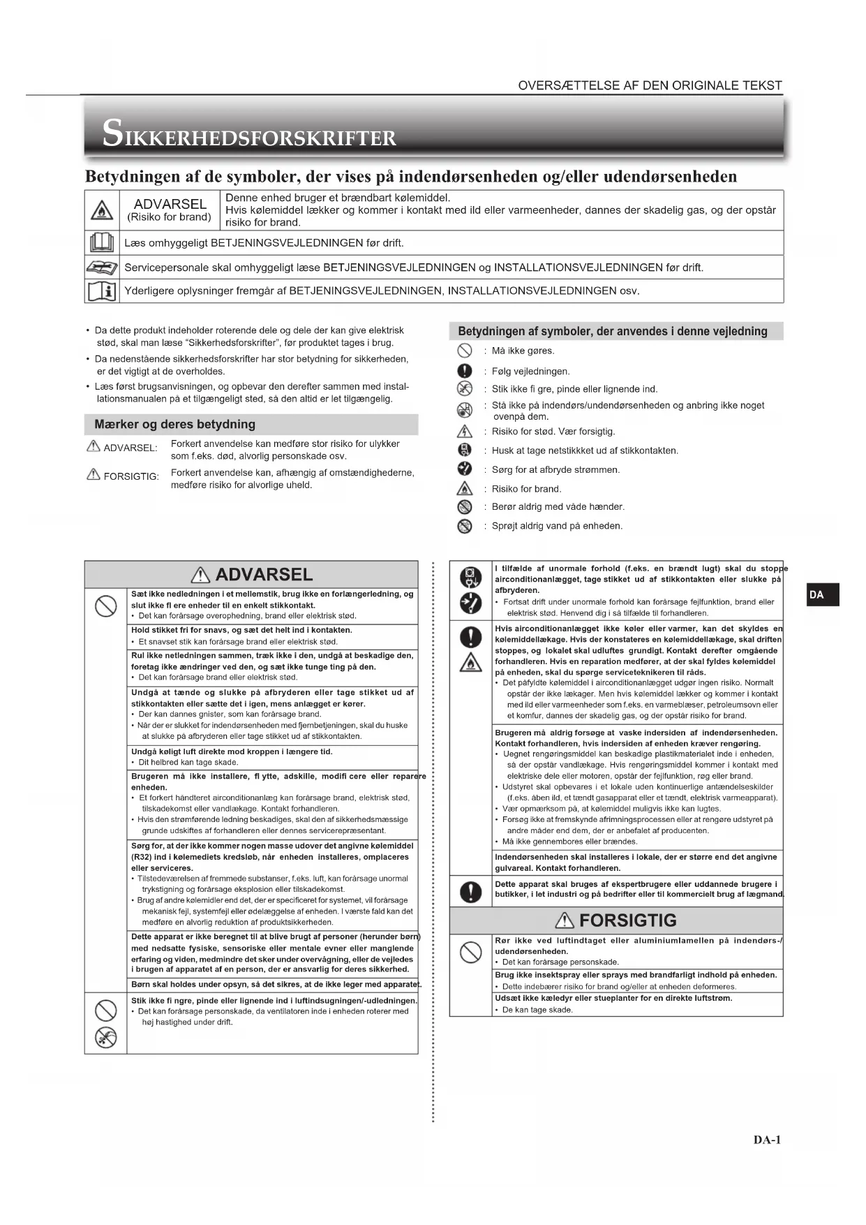 - Da dette produkt indeholder roterende dele og dele der kan give elektrisk stød, skal man læse “Sikkerhedsforskrifter”, før produktet tages i brug.• Da nedenstående sikkerhedsforskrifter har stor betydning for sikkerheden, er det vigtigt at de overholdes.• Læs først brugsanvisningen, og opbevar den derefter sammen med instal-lationsmanualen på et tilgængeligt sted, så den altid er let tilgængelig. Mærker og deres betydning ADVARSEL:Forkert anvendelse kan medføre stor risiko for ulykker som f.eks. død, alvorlig personskade osv. FORSIGTIG:Forkert anvendelse kan, afhængig af omstændighederne, medføre risiko for alvorlige uheld. Betydningen af symboler, der anvendes i denne vejledning : Må ikke gøres. : Følg vejledningen. : Stik ikke fi gre, pinde eller lignende ind. : Stå ikke på indendørs/undendørsenheden og anbring ikke noget ovenpå dem. : Risiko for stød. Vær forsigtig. : Husk at tage netstikkket ud af stikkontakten. : Sørg for at afbryde strømmen. : Risiko for brand. : Berør aldrig med våde hænder. : Sprøjt aldrig vand på enheden. SIKKERHEDSFORSKRIFTER ADVARSEL Sæt ikke nedledningen i et mellemstik, brug ikke en forlængerledning, og slut ikke fl ere enheder til en enkelt stikkontakt.• Det kan forårsage overophedning, brand eller elektrisk stød.Hold stikket fri for snavs, og sæt det helt ind i kontakten.• Et snavset stik kan forårsage brand eller elektrisk stød.Rul ikke netledningen sammen, træk ikke i den, undgå at beskadige den, foretag ikke ændringer ved den, og sæt ikke tunge ting på den.• Det kan forårsage brand eller elektrisk stød.Undgå at tænde og slukke på afbryderen eller tage stikket ud af stikkontakten eller sætte det i igen, mens anlægget er kører.• Der kan dannes gnister, som kan forårsage brand.• Når der er slukket for indendørsenheden med fjernbetjeningen, skal du huske at slukke på afbryderen eller tage stikket ud af stikkontakten. Undgå køligt luft direkte mod kroppen i længere tid.• Dit helbred kan tage skade.Brugeren må ikke installere, fl ytte, adskille, modifi cere eller reparere enheden.• Et forkert håndteret airconditionanlæg kan forårsage brand, elektrisk stød, tilskadekomst eller vandlækage. Kontakt forhandleren.• Hvis den strømførende ledning beskadiges, skal den af sikkerhedsmæssige grunde udskiftes af forhandleren eller dennes servicerepræsentant.Sørg for, at der ikke kommer nogen masse udover det angivne kølemiddel (R32) ind i kølemediets kredsløb, når enheden installeres, omplaceres eller serviceres.• Tilstedeværelsen af fremmede substanser, f.eks. luft, kan forårsage unormal trykstigning og forårsage eksplosion eller tilskadekomst.• Brug af andre kølemidler end det, der er specificeret for systemet, vil forårsage mekanisk fejl, systemfejl eller ødelæggelse af enheden. I værste fald kan det medføre en alvorlig reduktion af produktsikkerheden.Dette apparat er ikke beregnet til at blive brugt af personer (herunder børn) med nedsatte fysiske, sensoriske eller mentale evner eller manglende erfaring og viden, medmindre det sker under overvågning, eller de vejledes i brugen af apparatet af en person, der er ansvarlig for deres sikkerhed.Børn skal holdes under opsyn, så det sikres, at de ikke leger med apparatet. Stik ikke fi ngre, pinde eller lignende ind i luftindsugningen/-udledningen.• Det kan forårsage personskade, da ventilatoren inde i enheden roterer med høj hastighed under drift. I tilfælde af unormale forhold (f.eks. en brændt lugt) skal du stoppe airconditionanlægget, tage stikket ud af stikkontakten eller slukke på afbryderen.• Fortsat drift under unormale forhold kan forårsage fejlfunktion, brand eller elektrisk stød. Henvend dig i så tilfælde til forhandleren. Hvis airconditionanlægget ikke køler eller varmer, kan det skyldes en kølemiddellækage. Hvis der konstateres en kølemiddellækage, skal driften stoppes, og lokalet skal udluftes grundigt. Kontakt derefter omgående forhandleren. Hvis en reparation medfører, at der skal fyldes kølemiddel på enheden, skal du spørge serviceteknikeren til råds.• Det påfyldte kølemiddel i airconditionanlægget udgør ingen risiko. Normalt opstår der ikke lækager. Men hvis kølemiddel lækker og kommer i kontakt med ild eller varmeenheder som f.eks. en varmeblæser, petroleumsovn eller et komfur, dannes der skadelig gas, og der opstår risiko for brand.Brugeren må aldrig forsøge at vaske indersiden af indendørsenheden. Kontakt forhandleren, hvis indersiden af enheden kræver rengøring.• Uegnet rengøringsmiddel kan beskadige plastikmaterialet inde i enheden, så der opstår vandlækage. Hvis rengøringsmiddel kommer i kontakt med elektriske dele eller motoren, opstår der fejlfunktion, røg eller brand.• Udstyret skal opbevares i et lokale uden kontinuerlige antændelseskilder (f.eks. åben ild, et tændt gasapparat eller et tændt, elektrisk varmeapparat).• Vær opmærksom på, at kølemiddel muligvis ikke kan lugtes.• Forsøg ikke at fremskynde afrimningsprocessen eller at rengøre udstyret på andre måder end dem, der er anbefalet af producenten. • Må ikke gennembores eller brændes.Indendørsenheden skal installeres i lokale, der er større end det angivne gulvareal. Kontakt forhandleren.Dette apparat skal bruges af ekspertbrugere eller uddannede brugere i butikker, i let industri og på bedrifter eller til kommercielt brug af lægmand. FORSIGTIG Rør ikke ved luftindtaget eller aluminiumlamellen på indendørs-/udendørsenheden.• Det kan forårsage personskade.Brug ikke insektspray eller sprays med brandfarligt indhold på enheden.• Dette indebærer risiko for brand og/eller at enheden deformeres.Udsæt ikke kæledyr eller stueplanter for en direkte luftstrøm.• De kan tage skade. Betydningen af de symboler, der vises på indendørsenheden og/eller udendørsenheden ADVARSEL (Risiko for brand)Denne enhed bruger et brændbart kølemiddel.Hvis køle