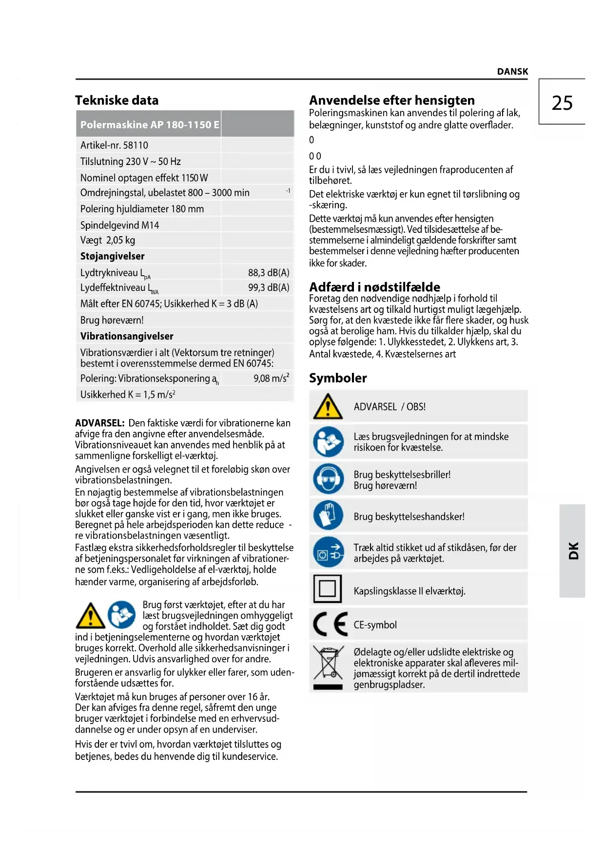 stemmelserne i almindeligt gældende forskrifter samt bestemmelser i denne vejledning hæfter producenten ikke for skader. Adfærd i nødstilfælde Foretag den nødvendige nødhjælp i forhold til kvæstelsens art og tilkald hurtigst muligt lægehjælp. Sørg for, at den kvæstede ikke får ere skader, og husk også at berolige ham. Hvis du tilkalder hjælp, skal du oplyse følgende: 1. Ulykkesstedet, 2. Ulykkens art, 3. Antal kvæstede, 4. Kvæstelsernes art Symboler ADVARSEL / OBS! Læs brugsvejledningen for at mindske risikoen for kvæstelse. Brug beskyttelsesbriller! Brug høreværn! Brug beskyttelseshandsker! Træk altid stikket ud af stikdåsen, før der arbejdes på værktøjet. Kapslingsklasse II elværktøj. CE-symbol Ødelagte og/eller udslidte elektriske og elektroniske apparater skal aeveres mil- jømæssigt korrekt på de dertil indrettede genbrugspladser.D