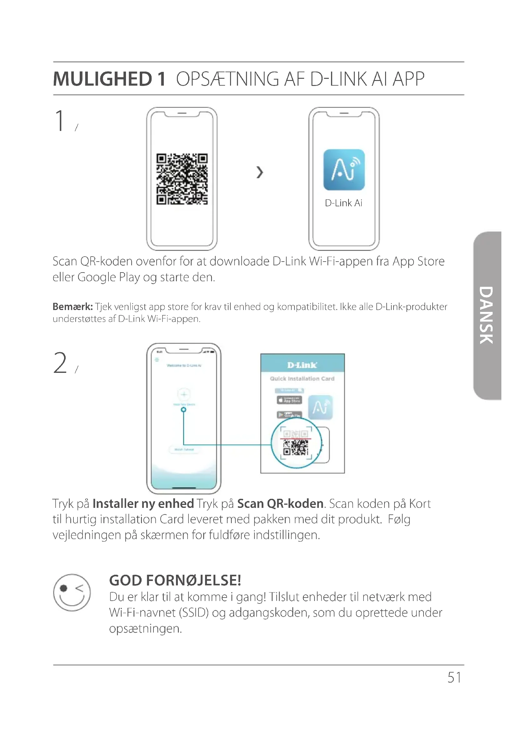 1 / Sæt extenderen til en strømkilde tæt på din router. 2 / Vent på, at strøm-LED-lampen på extenderen begynder at blinke gult.Bemærk: Se venligst mere om signaler fra LED-lampen på enheden i brugervejledningen. < 1 m < 1 m53 DANSK FÅ DET SJOVT! Du kan gå i gang! Tilslut enheder til netværk med Wi-Fi-navnet (SSID) og adgangskoden, som du oprettede under opsætningen. Skriv http://WXYZ.devicesetup.net/ i adresselinjen på en webbrowser. Følg vejledningen på skærmen for fuldføre indstillingen. 4 / 3 / Tilslut din computer til Wi-Fi-navnet og adgangskoden trykt på Kortet til hurtig installation, eller på enhedsmærkatet på enheden. Quick Installation Card “D-Link Ai ” dlink-xxxxConnectxxxxxxxxxxxxxxxxxxWi-Fi Name: E15-XXXXPassword: XXXXXXXX http://WXYZ.devicesetup.net/ Password:XXXXXX54 DANSK PLACERING En enkelt gul bjælke angiver et svagt signal. Flyt din extender tættere på din router for at få bedre signalkvalitet. Sørg for, at din extender er placeret i åbne omgivelser. Placér extenderen inden for rækkevidde af din router. Check LED- indikatoren på din extender for at sikre en korrekt forbindelse. Grønne bjælker angiver et stærkt signal. Bemærk: Se venligst mere om signaler fra LED-lampen på enheden i brugervejledningen. < 1 m < 1 m < 1 m < 1 m55 DANSK