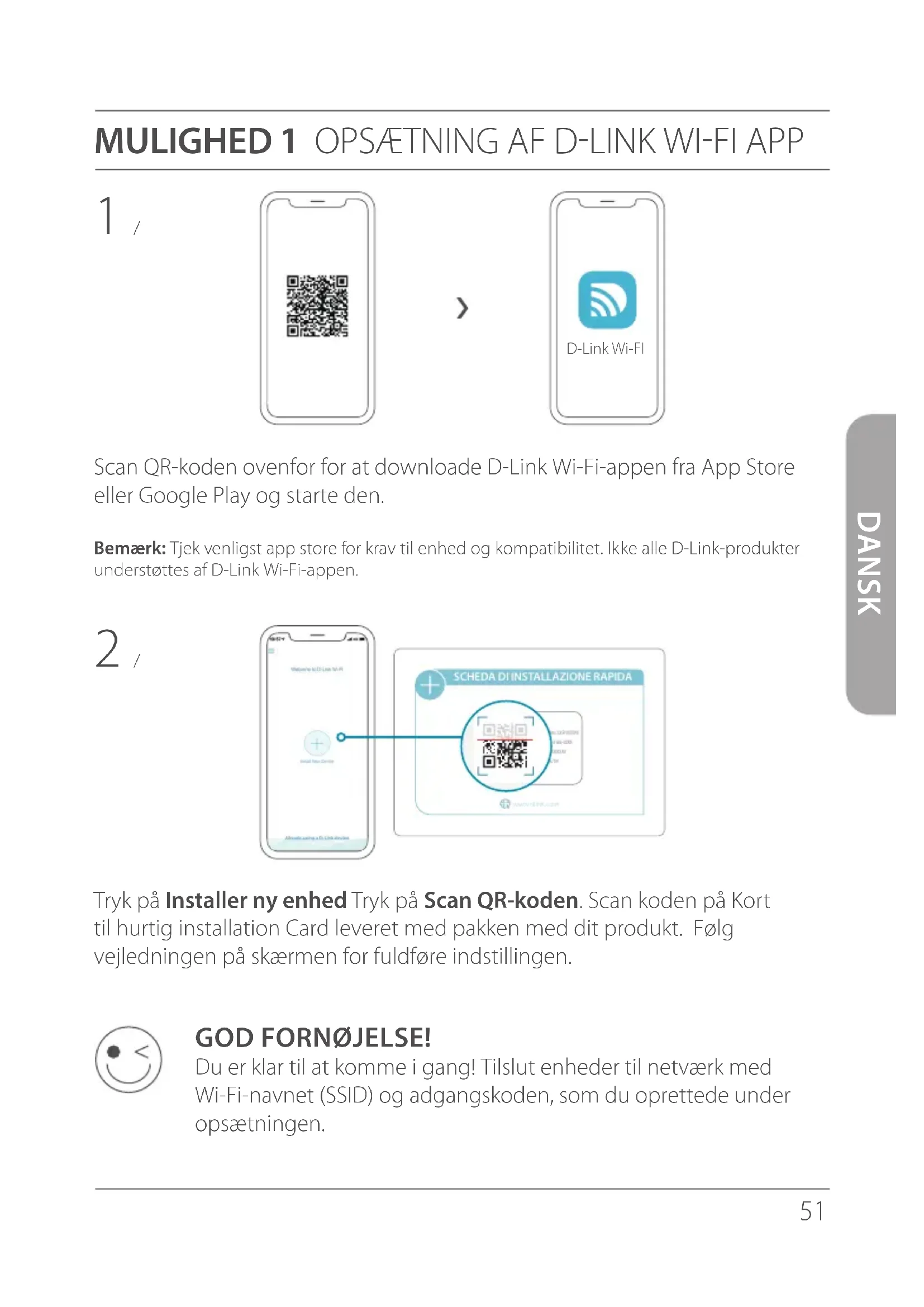1 / Sæt extenderen til en strømkilde tæt på din router. 2 / Vent på, at strøm-LED-lampen på extenderen begynder at blinke gult.Bemærk: Se venligst mere om signaler fra LED-lampen på enheden i brugervejledningen. < 1 m < 1 m53 DANSK FÅ DET SJOVT! Du kan gå i gang! Tilslut enheder til netværk med Wi-Fi-navnet (SSID) og adgangskoden, som du oprettede under opsætningen. Skriv http://dlinkap.local./ i adresselinjen på en webbrowser. Følg vejledningen på skærmen for fuldføre indstillingen. 4 / 3 / Tilslut din computer til Wi-Fi-navnet og adgangskoden trykt på Kortet til hurtig installation, eller på enhedsmærkatet på enheden.