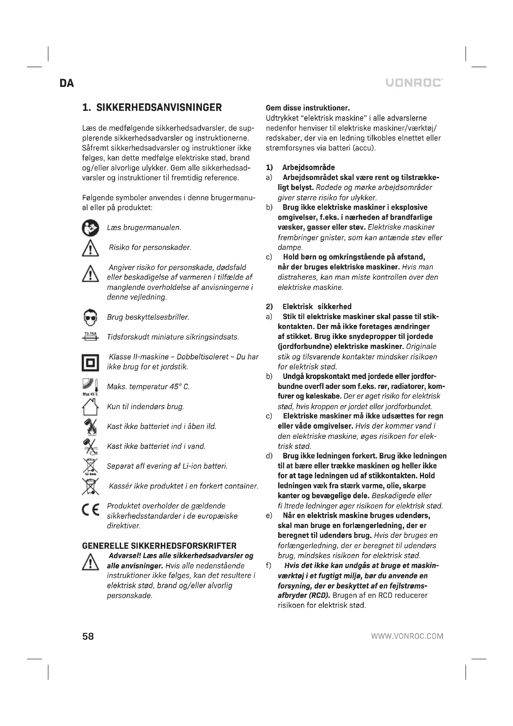 a) Åbn ikke batteriet. Fare for kortslutning. b) Beskyt batteriet mod varme, f.eks. mod kon- tinuerligt intenst sollys, brand, vand og fugt. Fare for eksplosion. c) I tilfælde af skade og forkert brug af batteriet, kan der blive udsendt dampe. Udluft området, og søg lægehjælp i tilfælde af klager. Dampene kan irritere åndedrætssystemet. d) Brug kun batteriet sammen med dit VON- ROC-produkt. Denne foranstaltning alene beskytter batteriet mod farlig overbelastning. e) Batteriet kan blive beskadiget af spidse gen- stande såsom søm eller skruetrækkere eller af eksternt påført kraft. Der kan opstå en intern kortslutning, og batteriet kan brænde, ryge, eksplodere eller bliver overophedet.