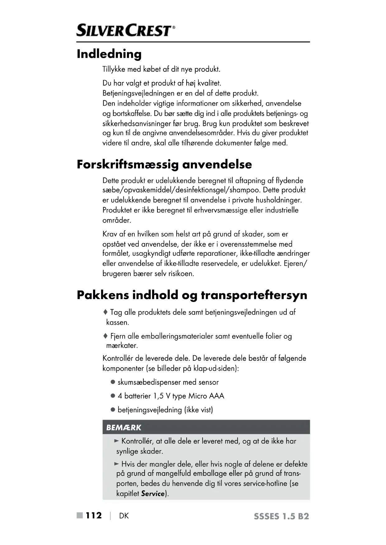 DK SSSES 1.5 B2 Indledning Tillykke med købet af dit nye produkt. Du har valgt et produkt af høj kvalitet. Betjeningsvejledningen er en del af dette produkt. Den indeholder vigtige informationer om sikkerhed, anvendelse og bortskaffelse. Du bør sætte dig ind i alle produktets betjenings- og sikkerhedsanvisninger før brug. Brug kun produktet som beskrevet og kun til de angivne anvendelsesområder. Hvis du giver produktet videre til andre, skal alle tilhørende dokumenter følge med. Forskriftsmæssig anvendelse Dette produkt er udelukkende beregnet til aftapning af flydende sæbe/opvaskemiddel/desinfektionsgel/shampoo. Dette produkt er udelukkende beregnet til anvendelse i private husholdninger. Produktet er ikke beregnet til erhvervsmæssige eller industrielle områder. Krav af en hvilken som helst art på grund af skader, som er opstået ved anvendelse, der ikke er i overensstemmelse med formålet, usagkyndigt udførte reparationer, ikke-tilladte ændringer eller anvendelse af ikke-tilladte reservedele, er udelukket. Ejeren/ brugeren bærer selv risikoen. Pakkens indhold og transporteftersyn ♦ Tag alle produktets dele samt betjeningsvejledningen ud af kassen. ♦ Fjern alle emballeringsmaterialer samt eventuelle folier og mærkater. Kontrollér de leverede dele. De leverede dele består af følgende komponenter (se billeder på klap-ud-siden): ▯ skumsæbedispenser med sensor ▯ 4 batterier 1,5 V type Micro AAA ▯ betjeningsvejledning (ikke vist) BEMÆRK ► Kontrollér, at alle dele er leveret med, og at de ikke har synlige skader. ► Hvis der mangler dele, eller hvis nogle af delene er defekte på grund af mangelfuld emballage eller på grund af trans- porten, bedes du henvende dig til vores service-hotline (se kapitlet Service).DK