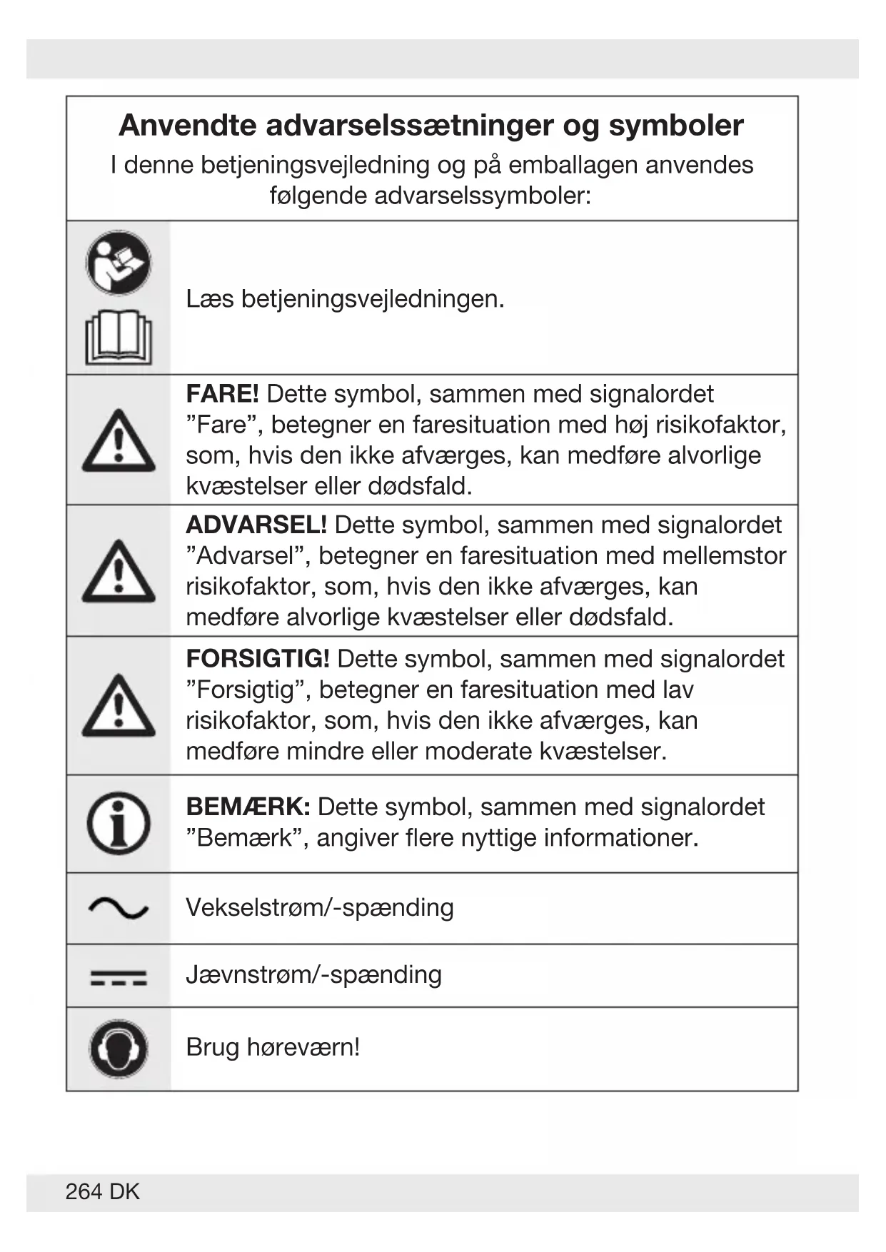 262 DK Anvendte advarselssætninger og symboler ................................ . . Side 264 Indledning ............................... . . Side 266 Forskriftsmæssig anvendelse................ . . Side 266 Oplysninger om varemærker ................ . . Side 266 Leveringsomfang ......................... . . Side 267 Beskrivelse af delene ...................... . . Side 267 Tekniske data ............................ . . Side 268 Sikkerhedsanvisninger .................. . . Side 270 Generelle sikkerhedsanvisninger for elektroværktøjer .......................... . . Side 270 Anvendelse og håndtering af batteridrevne værktøjer................................ . . Side 274 Sikkerhedsanvisninger for anvendelsen ........ . . Side 276 Yderligere sikkerhedsanvisninger for alle anvendelser ............................. . . Side 279 Sikkerhedsanvisninger for opladere ........... . . Side 280 Specikke sikkerhedsanvisninger for graveringsopgaver ........................ . . Side 281 Inden ibrugtagning ...................... . . Side 283 Opladning af genopladeligt batteri ............ . . Side 283 Indikator for batterikapacitet................. . . Side 284263DK Betjening ................................ . . Side 284 Til-/frakobling ............................ . . Side 285 Indstilling af graveringens dybde ............. . . Side 285 Udskiftning af graveringsspids ............... . . Side 285 Arbejdsanvisninger ........................ . . Side 286 Rengøring og vedligeholdelse ........... . . Side 287 Rengøring ............................... . . Side 287 Opbevaring .............................. . . Side 287 Transport ................................ . . Side 287 Bortskaelse ............................ . . Side 287 Garanti .................................. . . Side 289 Afvikling af garantisager .................... . . Side 290 Service .................................. . . Side 290 EU-overensstemmelseserklæring ....... . . Side 291264 DK Anvendte advarselssætninger og symboler I denne betjeningsvejledning og på emballagen anvendes følgende advarselssymboler: Læs betjeningsvejledningen. FARE! Dette symbol, sammen med signalordet ”Fare”, betegner en faresituation med høj risikofaktor, som, hvis den ikke afværges, kan medføre alvorlige kvæstelser eller dødsfald. ADVARSEL! Dette symbol, sammen med signalordet ”Advarsel”, betegner en faresituation med mellemstor risikofaktor, som, hvis den ikke afværges, kan medføre alvorlige kvæstelser eller dødsfald. FORSIGTIG! Dette symbol, sammen med signalordet ”Forsigtig”, betegner en faresituation med lav risikofaktor, som, hvis den ikke afværges, kan medføre mindre eller moderate kvæstelser. BEMÆRK: Dette symbol, sammen med signalordet ”Bemærk”, angiver ere nyttige informationer. Vekselstrøm/-spænding Jævnstrøm/-spænding