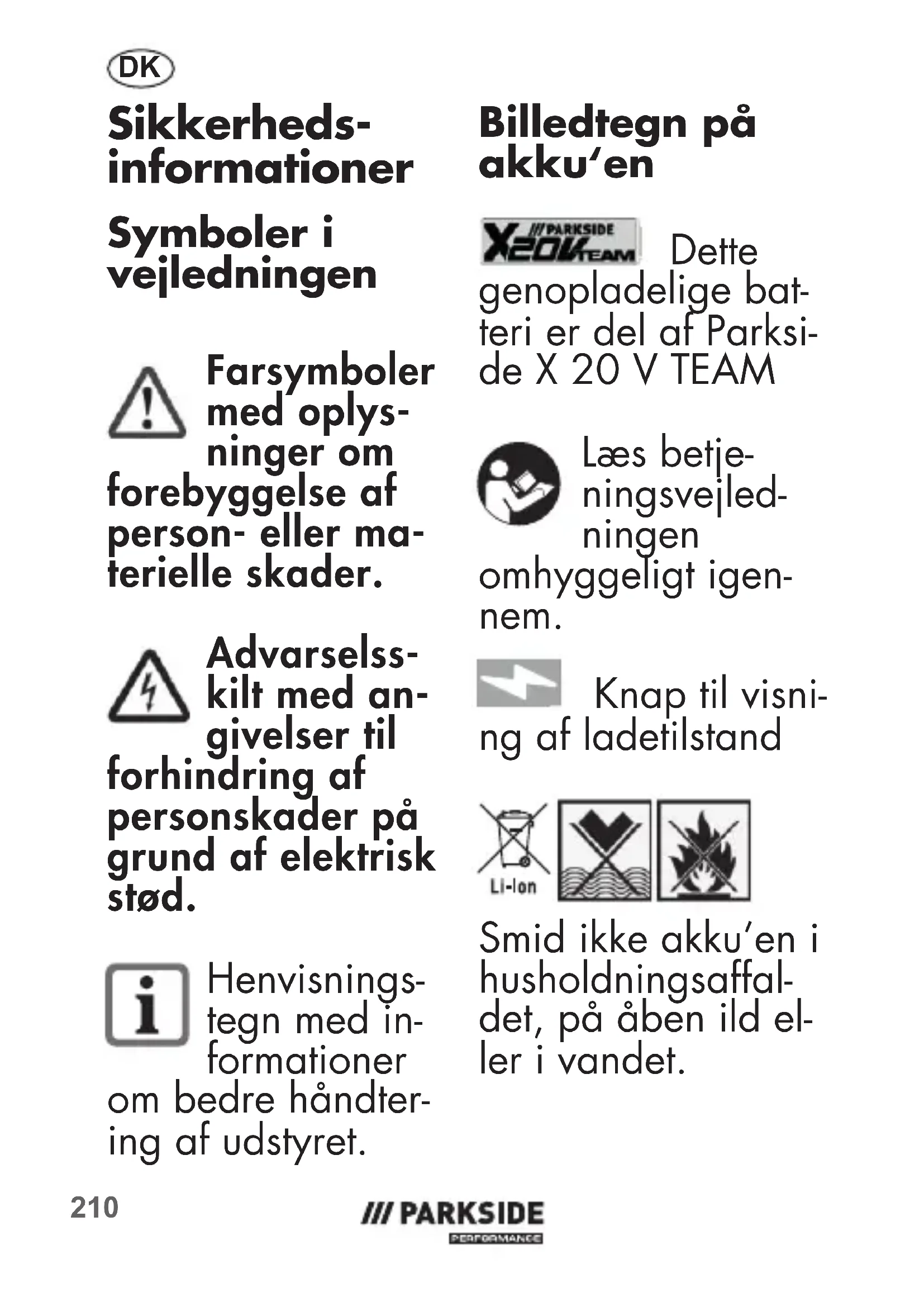 Sikkerheds- informationer Symboler i vejledningen Farsymboler med oplys- ninger om forebyggelse af person- eller ma- terielle skader. Advarselss- kilt med an- givelser til forhindring af personskader på grund af elektrisk stød. Henvisnings- tegn med in- formationer om bedre håndter- ing af udstyret. Billedtegn på akku‘en Dette genopladelige bat- teri er del af Parksi- de X20VTEAM Læs betje- ningsvejled- ningen omhyggeligt igen- nem. Knap til visni- ng af ladetilstand Smid ikke akku’en i husholdningsaffal- det, på åben ild el- ler i vandet.211