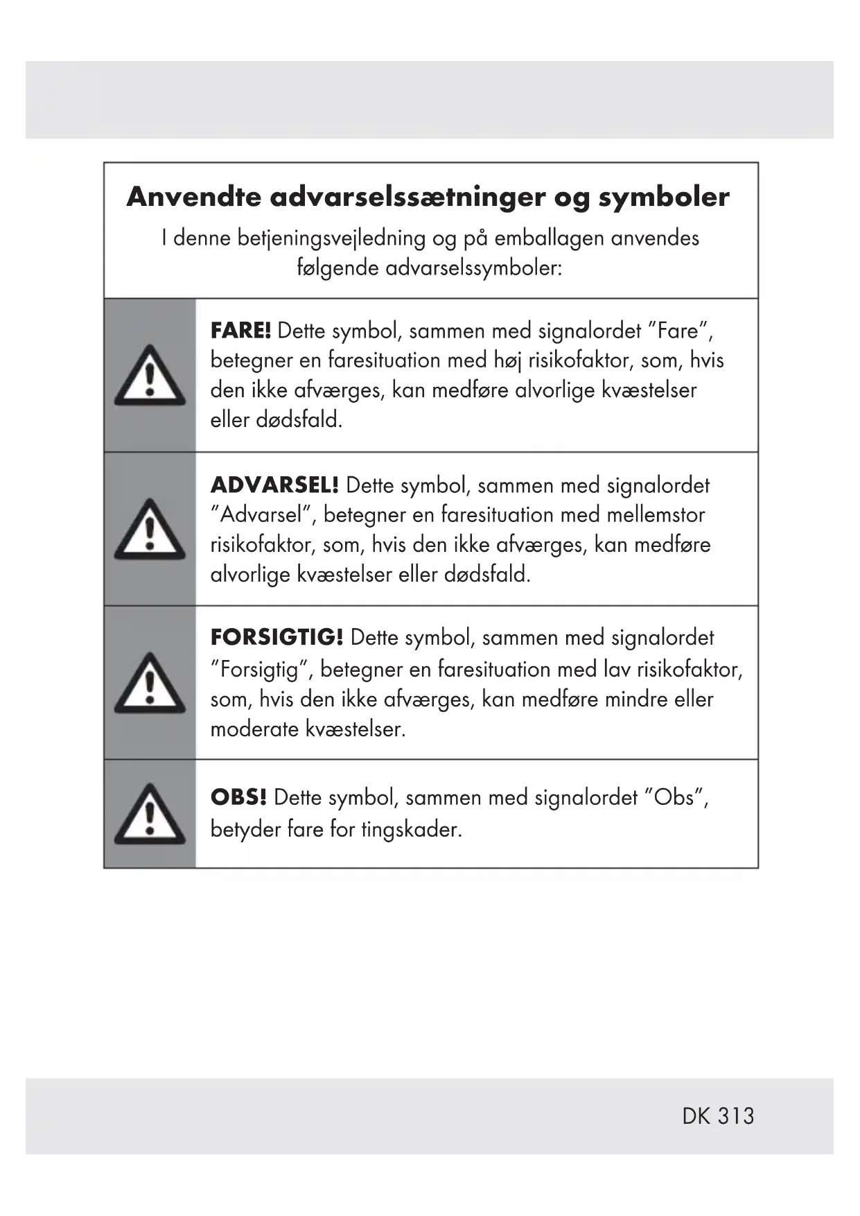 Anvendte advarselssætninger og symboler I denne betjeningsvejledning og på emballagen anvendes følgende advarselssymboler: FARE! Dette symbol, sammen med signalordet ”Fare”, betegner en faresituation med høj risikofaktor, som, hvis den ikke afværges, kan medføre alvorlige kvæstelser eller dødsfald. ADVARSEL! Dette symbol, sammen med signalordet ”Advarsel”, betegner en faresituation med mellemstor risikofaktor, som, hvis den ikke afværges, kan medføre alvorlige kvæstelser eller dødsfald. FORSIGTIG! Dette symbol, sammen med signalordet ”Forsigtig”, betegner en faresituation med lav risikofaktor, som, hvis den ikke afværges, kan medføre mindre eller moderate kvæstelser. OBS! Dette symbol, sammen med signalordet ”Obs”, betyder fare for tingskader.314