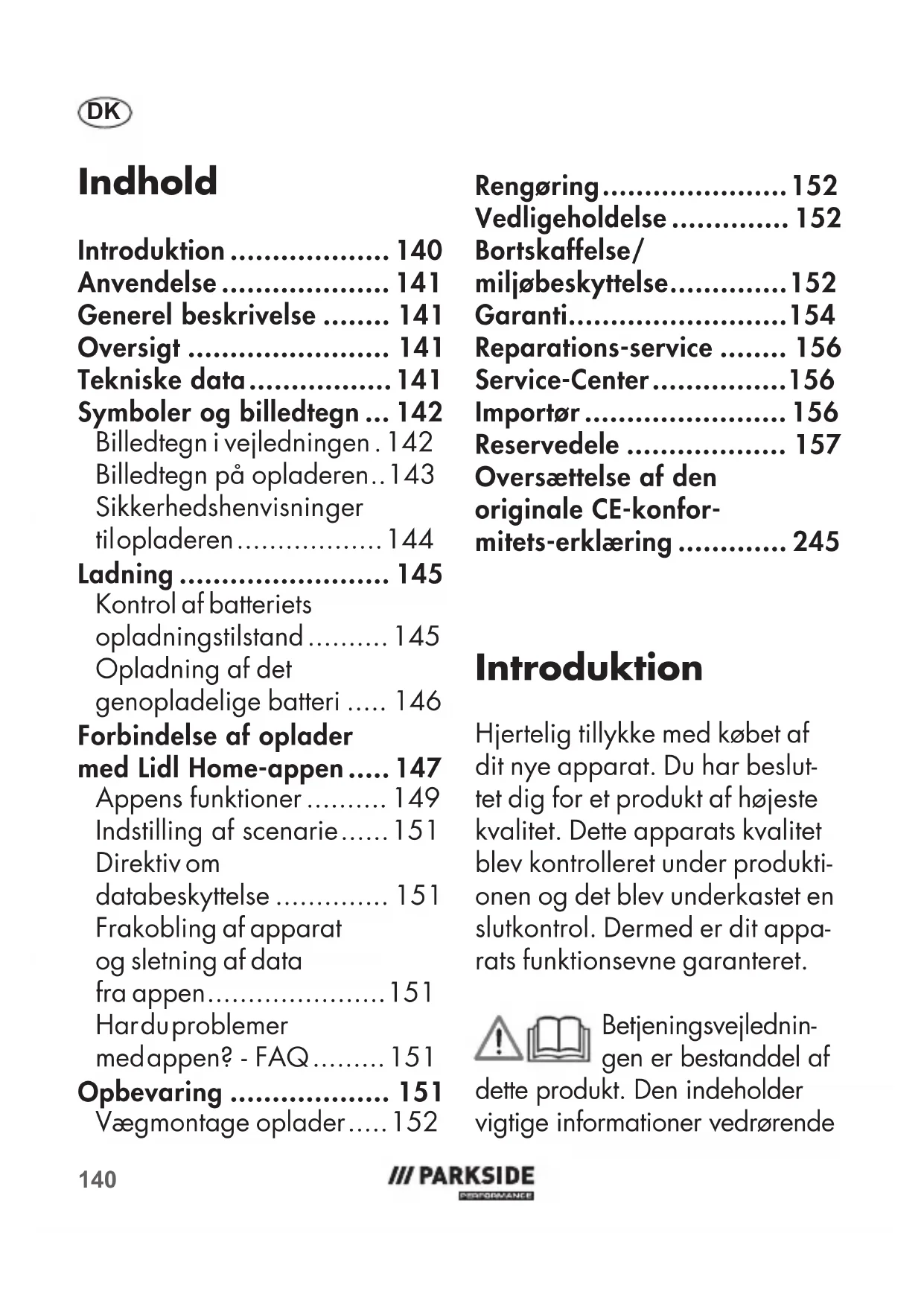 - Reservedele Introduktion Hjertelig tillykke med købet af dit nye apparat. Du har beslut- tet dig for et produkt af højeste kvalitet. Dette apparats kvalitet blev kontrolleret under produkti- onen og det blev underkastet en slutkontrol. Dermed er dit appa- rats funktionsevne garanteret. Betjeningsvejlednin- gen er bestanddel af dette produkt. Den indeholder vigtige informationer vedrørende141 p. 157
