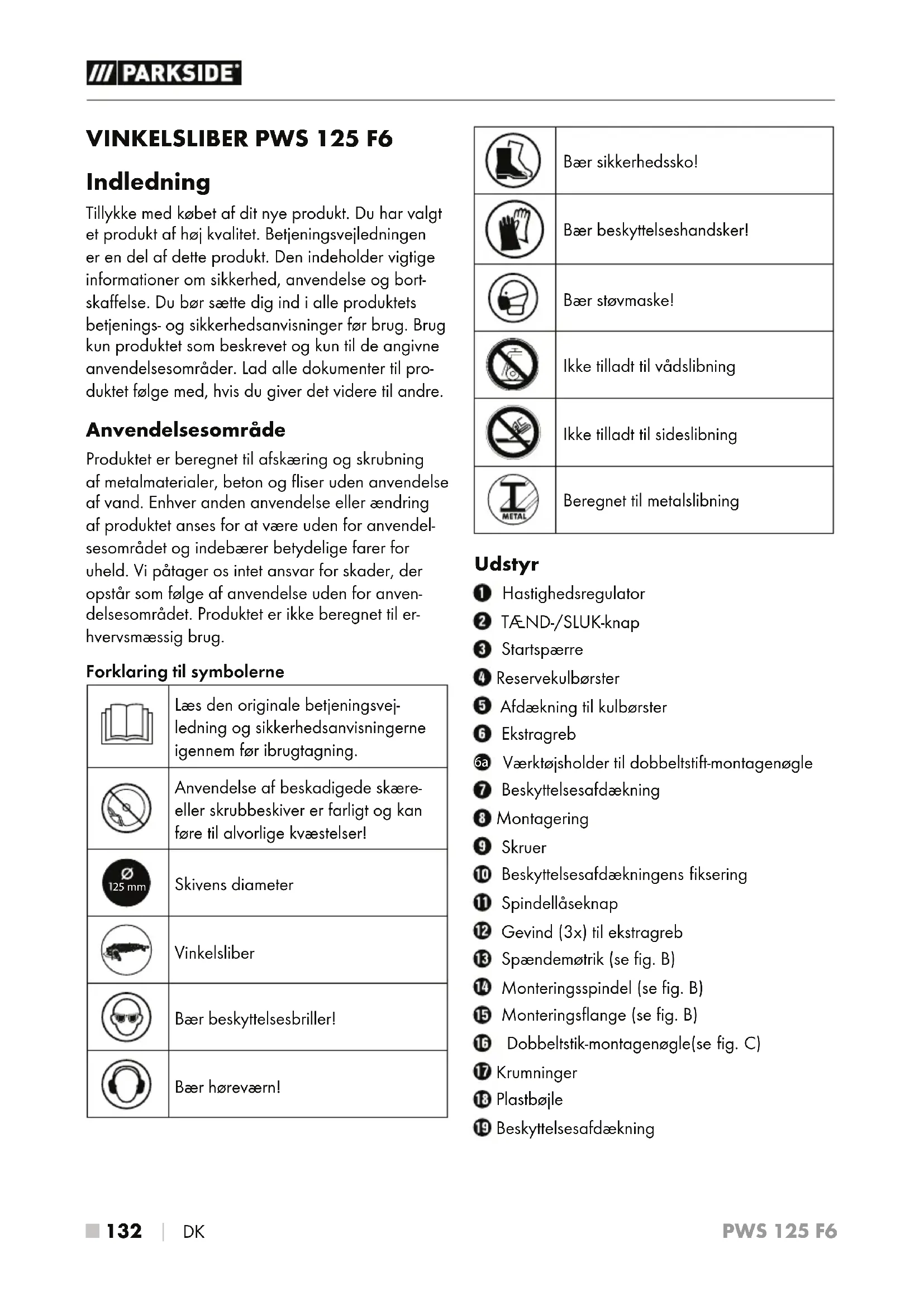 BRUGSANVISNING PWS 125 F6 PARKSIDE