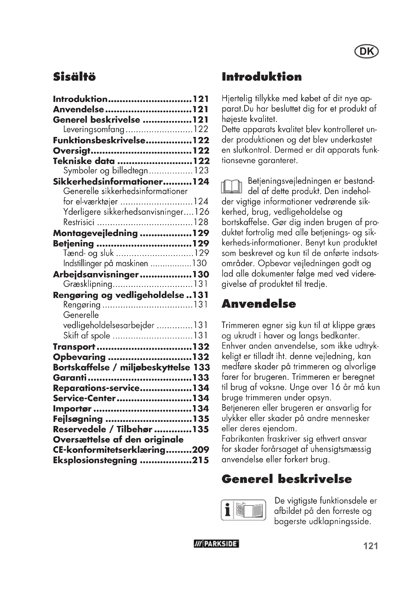 - Eksplosionstegning Introduktion Hjertelig tillykke med købet af dit nye ap- parat.Du har besluttet dig for et produkt af højeste kvalitet. Dette apparats kvalitet blev kontrolleret un- der produktionen og det blev underkastet en slutkontrol. Dermed er dit apparats funk- tionsevne garanteret. Betjeningsvejledningen er bestand- del af dette produkt. Den indehol- der vigtige informationer vedrørende sik- kerhed, brug, vedligeholdelse og bortskaffelse. Gør dig inden brugen af pro- duktet fortrolig med alle betjenings- og sik- kerheds-informationer. Benyt kun produktet som beskrevet og kun til de anførte indsats- områder. Opbevar vejledningen godt og lad alle dokumenter følge med ved videre- givelse af produktet til tredje. Anvendelse Trimmeren egner sig kun til at klippe græs og ukrudt i haver og langs bedkanter. Enhver anden anvendelse, som ikke udtryk- keligt er tilladt iht. denne vejledning, kan medføre skader på trimmeren og alvorlige farer for brugeren. Trimmeren er beregnet til brug af voksne. Unge over 16 år må kun bruge trimmeren under opsyn. Betjeneren eller brugeren er ansvarlig for ulykker eller skader på andre mennesker eller deres ejendom. Fabrikanten fraskriver sig ethvert ansvar for skader forårsaget af uhensigtsmæssig anvendelse eller forkert brug. Generel beskrivelse De vigtigste funktionsdele er afbildet på den forreste og bagerste udklapningsside.DK p. 215