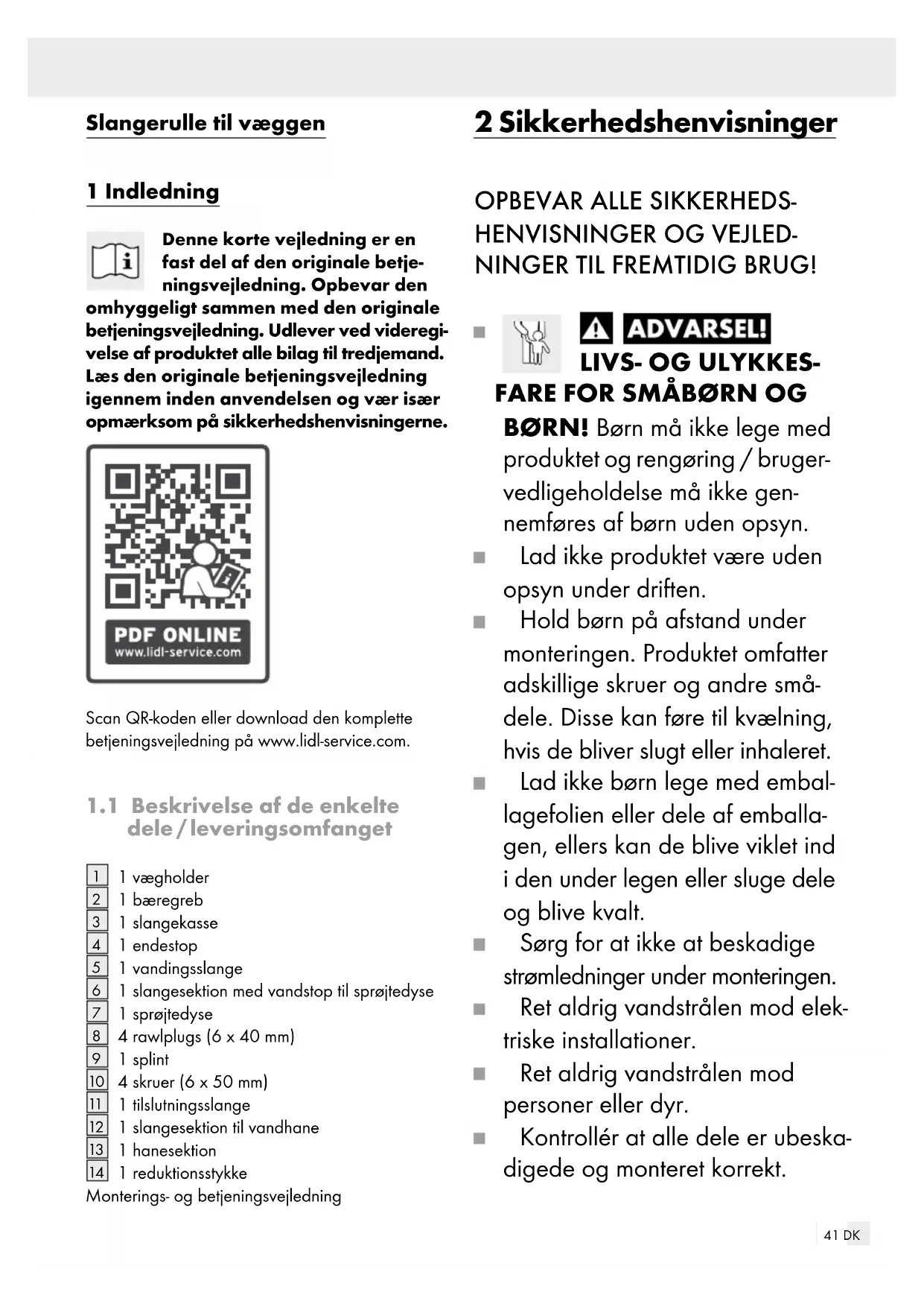 hacia la pared para ahorrar espacio (ver fig. B).41 DK Slangerulle til væggen 1 Indledning Denne korte vejledning er en fast del af den originale betje- ningsvejledning. Opbevar den omhyggeligt sammen med den originale betjeningsvejledning. Udlever ved videregi- velse af produktet alle bilag til tredjemand. Læs den originale betjeningsvejledning igennem inden anvendelsen og vær især opmærksom på sikkerhedshenvisningerne. Scan QR-koden eller download den komplette betjeningsvejledning på www.lidl-service.com.
