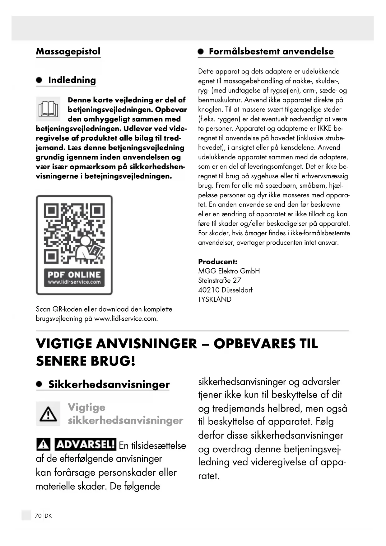 den omhyggeligt sammen med betjeningsvejledningen. Udlever ved vide- regivelse af produktet alle bilag til tred- jemand. Læs denne betjeningsvejledning grundig igennem inden anvendelsen og vær især opmærksom på sikkerhedshen- visningerne i betejningsvejledningen. Scan QR-koden eller download den komplette brugsvejledning på www.lidl-service.com. Formålsbestemt anvendelse Dette apparat og dets adaptere er udelukkende egnet til massagebehandling af nakke-, skulder-, ryg- (med undtagelse af rygsøjlen), arm-, sæde- og benmuskulatur. Anvend ikke apparatet direkte på knoglen. Til at massere svært tilgængelige steder (f.eks. ryggen) er det eventuelt nødvendigt at være to personer. Apparatet og adapterne er IKKE be- regnet til anvendelse på hovedet (inklusive strube- hovedet), i ansigtet eller på kønsdelene. Anvend udelukkende apparatet sammen med de adaptere, som er en del af leveringsomfanget. Det er ikke be- regnet til brug på sygehuse eller til erhvervsmæssig brug. Frem for alle må spædbørn, småbørn, hjæl- peløse personer og dyr ikke masseres med appara- tet. En anden anvendelse end den før beskrevne eller en ændring af apparatet er ikke tilladt og kan føre til skader og/eller beskadigelser på apparatet. For skader, hvis årsager findes i ikke-formålsbestemte anvendelser, overtager producenten intet ansvar. Producent: MGG Elektro GmbH Steinstraße 27 40210 Düsseldorf TYSKLAND