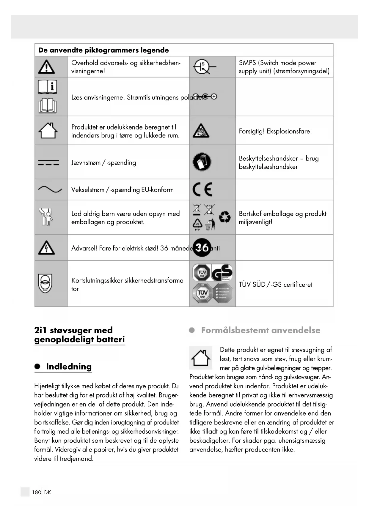 PAP Bortskaf emballage og produkt miljøvenligt! Advarsel! Fare for elektrisk stød! 36 måneders garanti Kortslutningssikker sikkerhedstransforma- tor TÜV SÜD / -GS certificeret 2i1 støvsuger med genopladeligt batteri Indledning
