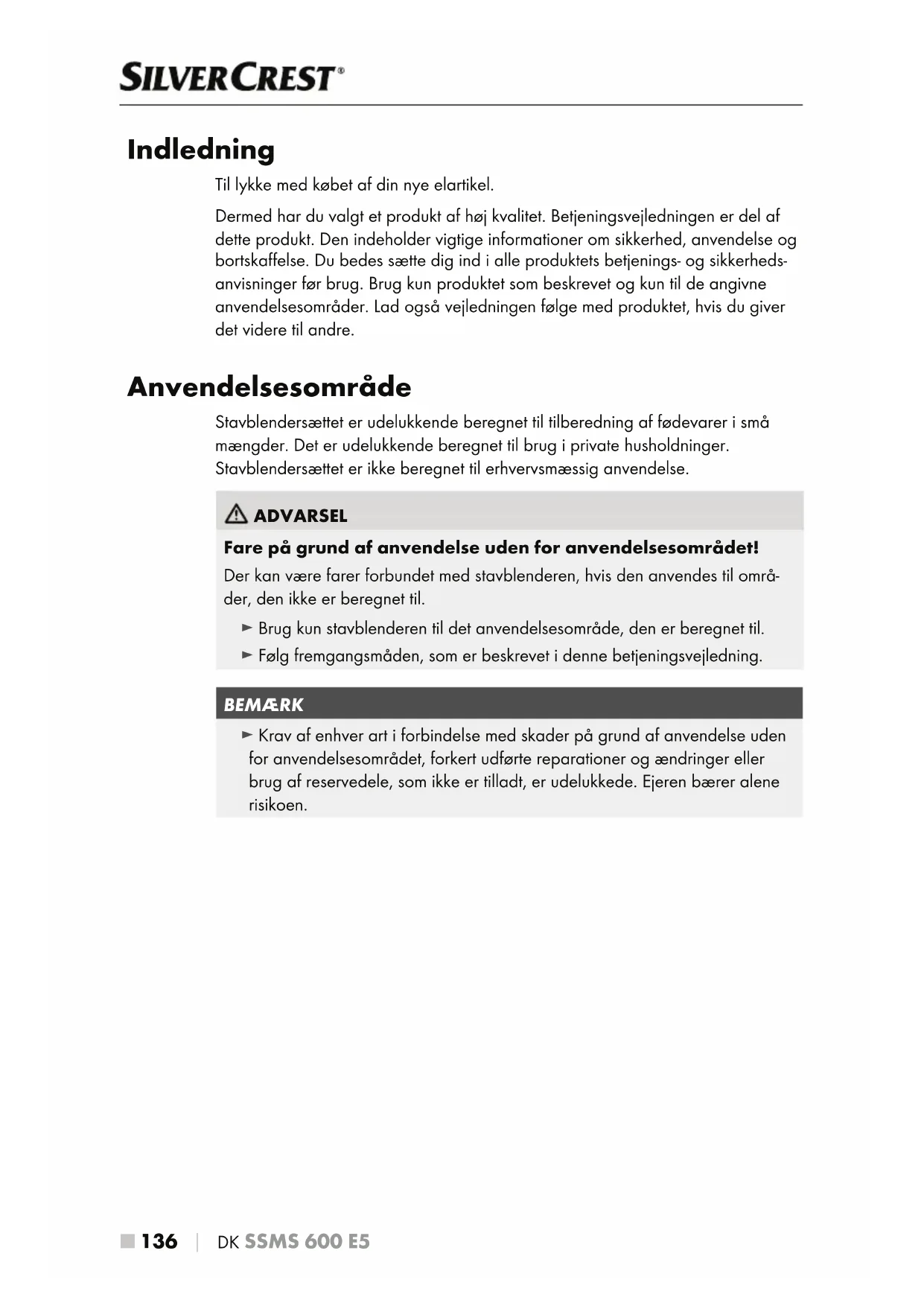 Indledning Til lykke med købet af din nye elartikel. Dermed har du valgt et produkt af høj kvalitet. Betjeningsvejledningen er del af dette produkt. Den indeholder vigtige informationer om sikkerhed, anvendelse og bortskaffelse. Du bedes sætte dig ind i alle produktets betjenings- og sikkerheds- anvisninger før brug. Brug kun produktet som beskrevet og kun til de angivne anvendelsesområder. Lad også vejledningen følge med produktet, hvis du giver det videre til andre. Anvendelsesområde Stavblendersættet er udelukkende beregnet til tilberedning af fødevarer i små mængder. Det er udelukkende beregnet til brug i private husholdninger. Stavblendersættet er ikke beregnet til erhvervsmæssig anvendelse. ADVARSEL Fare på grund af anvendelse uden for anvendelsesområdet! Der kan være farer forbundet med stavblenderen, hvis den anvendes til områ- der, den ikke er beregnet til. ► Brug kun stavblenderen til det anvendelsesområde, den er beregnet til. ► Følg fremgangsmåden, som er beskrevet i denne betjeningsvejledning. BEMÆRK ► Krav af enhver art i forbindelse med skader på grund af anvendelse uden for anvendelsesområdet, forkert udførte reparationer og ændringer eller brug af reservedele, som ikke er tilladt, er udelukkede. Ejeren bærer alene risikoen.DK