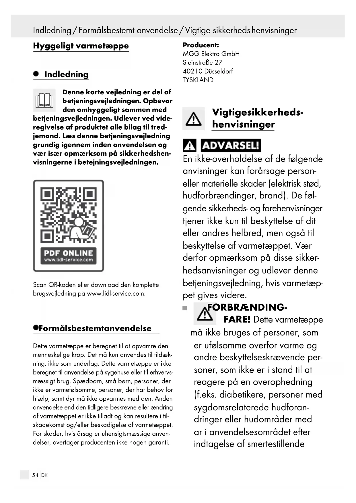 den omhyggeligt sammen med betjeningsvejledningen. Udlever ved vide- regivelse af produktet alle bilag til tred- jemand. Læs denne betjeningsvejledning grundig igennem inden anvendelsen og vær især opmærksom på sikkerhedshen- visningerne i betejningsvejledningen. Scan QR-koden eller download den komplette brugsvejledning på www.lidl-service.com. Formålsbestemt anvendelse Dette varmetæppe er beregnet til at opvamre den menneskelige krop. Det må kun anvendes til tildæk- ning, ikke som underlag. Dette varmetæppe er ikke beregnet til anvendelse på sygehuse eller til erhvervs- mæssigt brug. Spædbørn, små børn, personer, der ikke er varmefølsomme, personer, der har behov for hjælp, samt dyr må ikke opvarmes med den. Anden anvendelse end den tidligere beskrevne eller ændring af varmetæppet er ikke tilladt og kan resultere i til- skadekomst og/eller beskadigelse af varmetæppet. For skader, hvis årsag er uhensigtsmæssige anven- delser, overtager producenten ikke nogen garanti. Producent: MGG Elektro GmbH Steinstraße 27 40210 Düsseldorf TYSKLAND Vigtige sikkerheds- henvisninger En ikke-overholdelse af de følgende anvisninger kan forårsage person- eller materielle skader (elektrisk stød, hudforbrændinger, brand). De føl- gende sikkerheds- og farehenvisninger tjener ikke kun til beskyttelse af dit eller andres helbred, men også til beskyttelse af varmetæppet. Vær derfor opmærksom på disse sikker- hedsanvisninger og udlever denne betjeningsvejledning, hvis varmetæp- pet gives videre. FORBRÆNDING- FARE! Dette varmetæppe må ikke bruges af personer, som er ufølsomme overfor varme og andre beskyttelseskrævende per- soner, som ikke er i stand til at reagere på en overophedning (f.eks. diabetikere, personer med sygdomsrelaterede hudforan- dringer eller hudområder med ar i anvendelsesområdet efter indtagelse af smertestillende55 DK Vigtige sikkerheds henvisninger medicin eller alkohol). Der er risiko for hudforbrændinger. Dette varmetæppe må ikke anvendes ved meget unge børn (0–3 år), da disse ikke er i stand til at reagere på en over- ophedning. Der er risiko for hud- forbrændinger. Dette varmetæppe kan bruges af børn ældre end 3 år og yngre end 8 år, forudsat de er under opsyn og kontakten hele tiden er indstillet på det laveste temperaturtrin. Ellers er der fare for hudforbrændinger. Dette varmetæppe kan benyttes af børn fra 8-årsalderen og opad, samt af personer med forringede fysiske, følelsesmæssige eller mentale evner eller mangel på erfaring og viden,når de er un- der opsyn eller er blevet vejledt med hensyn til sikker brug af varmepuden og har forstået de derudaf resulterende farer. Børn skal være under opsyn,så de ikke leger med varmetæppet. Der er risiko for tilskadekomst. Rengøring og brugervedligehol- delse må ikke gennemføres af børn uden at være under opsyn. Der er risiko for tilskadekomst. Dette varmetæppe er ikke beregnet til anvendelse i sygehuse eller til erhvervsmæssig brug. Der er fare for skader og / eller beskadigelser på varmetæppet. Stik ikke nåle eller spidse genstande i varmetæppet. Der er risiko for elektrisk stød. Tænd ikke for varmetæp- pet i foldet eller sammenkrøllet tilstand. Ellers kan varmetæppet beskadiges. Må ikke bruges i våd tilstand! El- lers er der risiko for elektrisk stød. Dette varmetæppe må kun an- vendes i forbindelse med den på etiketten angivne betjeningsdel. Ellers kan varmetæppet beskadiges. De elektriske og magnetiske felter, der udgår fra dette varmetæppe kan under omstændighed forsty rre din pacemakers funktion. De lig- ger dog langt under grænsevær- dierne, elektrisk feltstyrke: maks. 5000 V / m, magnetisk feltstyrke: maks. 80 A / m magnetisk fluxtæt- hed: maks. 0,1 milli-tesla. Spørg derfor venligst deres læge og deres pacemakers producent in- den brug af denne fodvarmer.56 DK Vigtige sikkerheds henvisninger / Sikkerhedssystem De må ikke trække, dreje eller knække ledningerne kraftigt. El- lers kan varmetæppet beskadiges. Dette varmetæppes ledning og kontakt kan ved uhensigtsmæssig anbringelse indebære fare for sam- menfiltring, strangulering, snublen eller betræden. Brugeren skal ge- nerelt sørge for, at ekstra kabler og ledninger installeres korrekt. Dette varmetæppe skal kontrolle- res hyppigt for tegn på slid eller beskadigelse. Såfremt der er så- danne tegn på at varmetæppet er blevet brugt uhensigtsmæssigt eller ikke varmer mere, så skal det kontrolleres af producenten inden det tændes påny. Når dette varmtetæppes nettils- lutningsledning beskadiges, så skal det erstattes af producenten eller hans kundeservice eller en lignende kvalificeret person for at undgå farer. Mens dette varmetæppe er tændt, så må