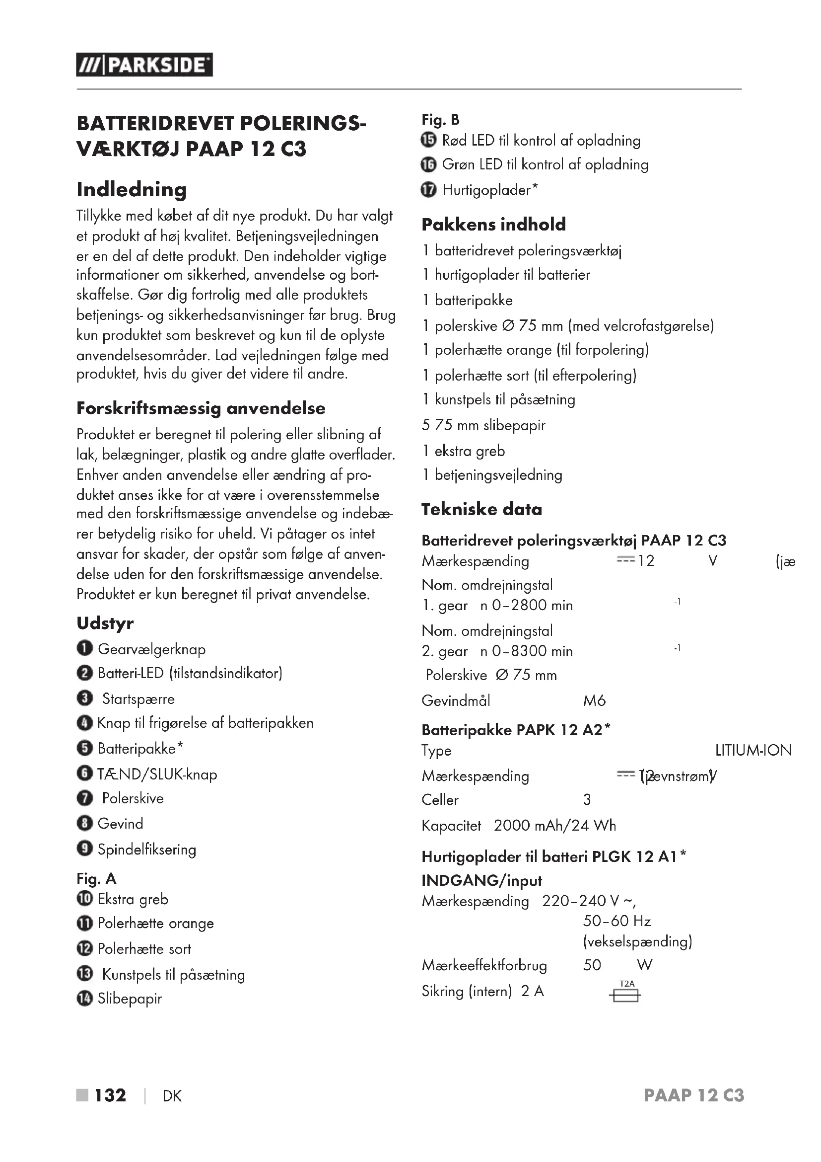 Indledning Tillykke med købet af dit nye produkt. Du har valgt et produkt af høj kvalitet. Betjeningsvejledningen er en del af dette produkt. Den indeholder vigtige informationer om sikkerhed, anvendelse og bort- skaffelse. Gør dig fortrolig med alle produktets betjenings- og sikkerhedsanvisninger før brug. Brug kun produktet som beskrevet og kun til de oplyste anvendelsesområder. Lad vejledningen følge med produktet, hvis du giver det videre til andre. Forskriftsmæssig anvendelse Produktet er beregnet til polering eller slibning af lak, belægninger, plastik og andre glatte overflader. Enhver anden anvendelse eller ændring af pro- duktet anses ikke for at være i overensstemmelse med den forskriftsmæssige anvendelse og indebæ- rer betydelig risiko for uheld. Vi påtager os intet ansvar for skader, der opstår som følge af anven- delse uden for den forskriftsmæssige anvendelse. Produktet er kun beregnet til privat anvendelse. Udstyr Gearvælgerknap Batteri-LED (tilstandsindikator) Startspærre Knap til frigørelse af batteripakken Batteripakke* TÆND/SLUK-knap Polerskive Gevind Spindelfiksering Fig. A Ekstra greb Polerhætte orange Polerhætte sort Kunstpels til påsætning Slibepapir Fig. B Rød LED til kontrol af opladning Grøn LED til kontrol af opladning Hurtigoplader* Pakkens indhold 1 batteridrevet poleringsværktøj 1 hurtigoplader til batterier 1 batteripakke 1 polerskive Ø 75 mm (med velcrofastgørelse) 1 polerhætte orange (til forpolering) 1 polerhætte sort (til efterpolering) 1 kunstpels til påsætning 5 75 mm slibepapir 1 ekstra greb 1 betjeningsvejledning Tekniske data Batteridrevet poleringsværktøj PAAP 12 C3 Mærkespænding 12 V (jævnstrøm) Nom. omdrejningstal