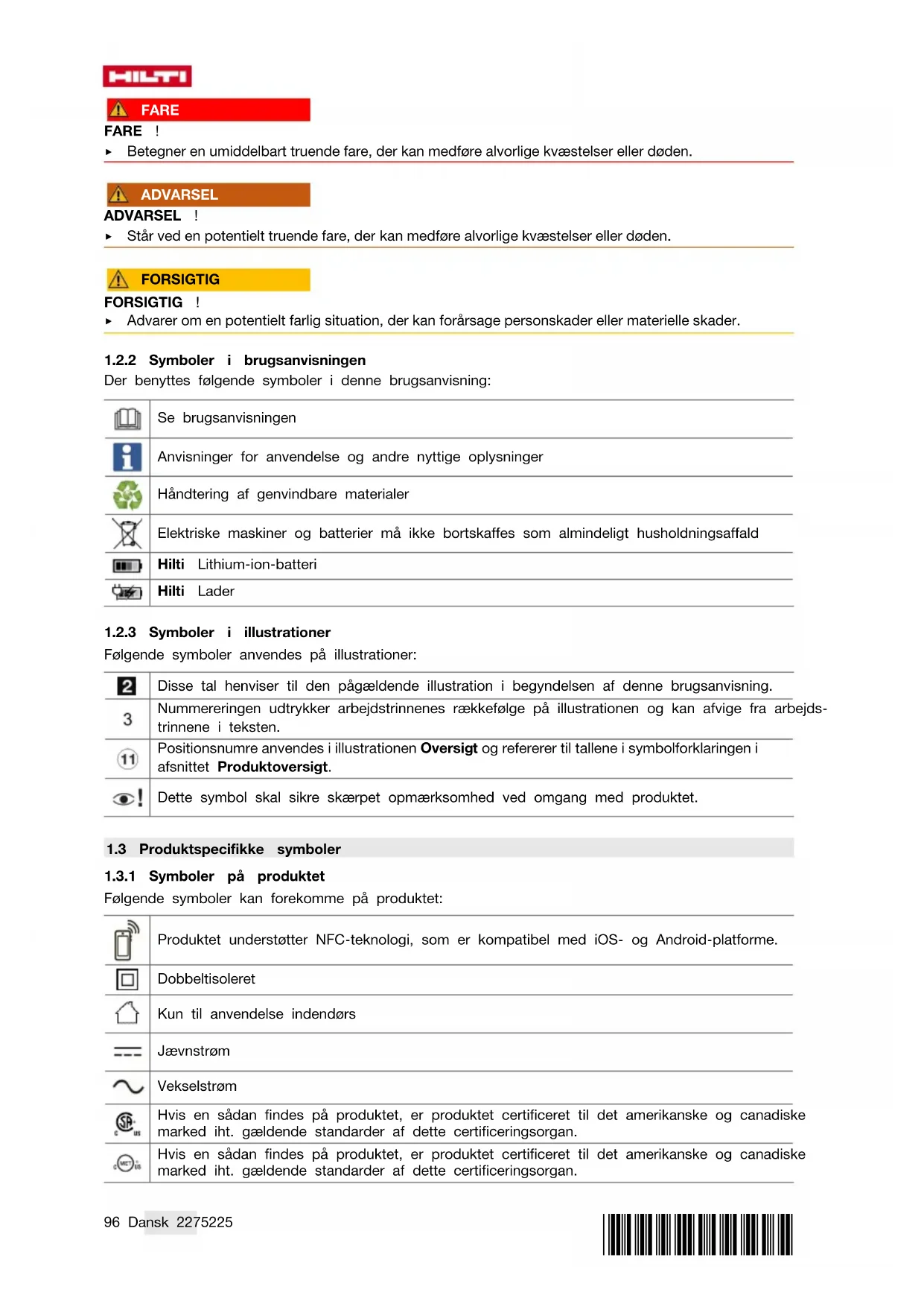 Der benyttes følgende symboler i denne brugsanvisning: Se brugsanvisningen Anvisninger for anvendelse og andre nyttige oplysninger Håndtering af genvindbare materialer Elektriske maskiner og batterier må ikke bortskaffes som almindeligt husholdningsaffald Hilti Lithium-ion-batteri Hilti Lader