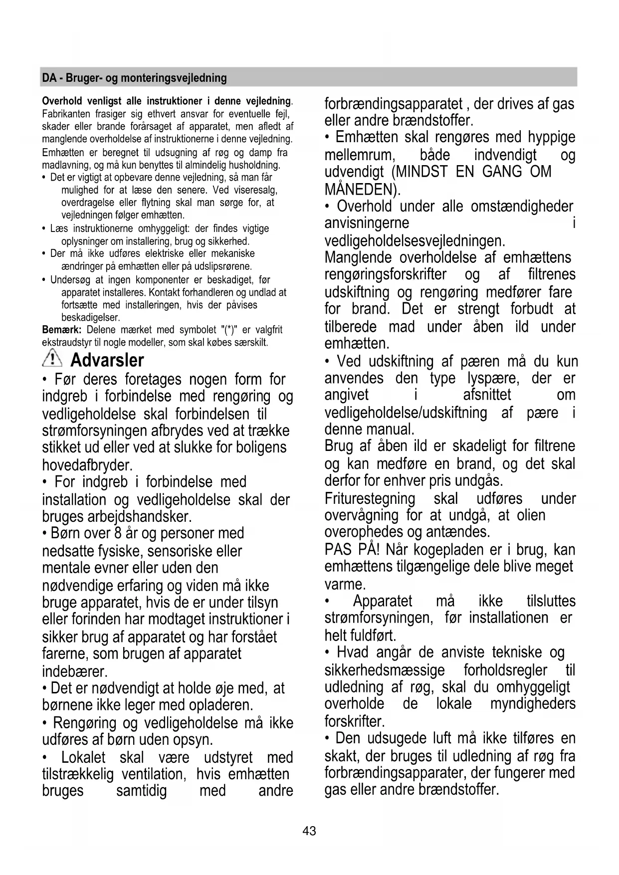 - Overhold under alle omstændigheder anvisningerne i vedligeholdelsesvejledningen. Manglende overholdelse af emhættens rengøringsforskrifter og af filtrenes udskiftning og rengøring medfører fare for brand. Det er strengt forbudt at tilberede mad under åben ild under emhætten.