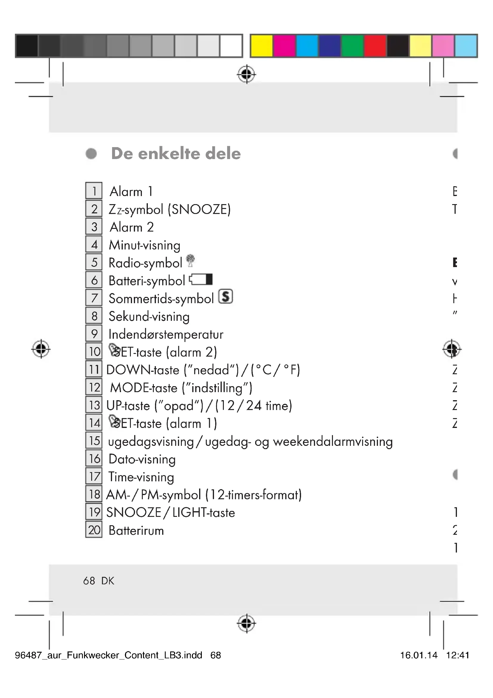Batterirum 96487_aur_Funkwecker_Content_LB3.indd 68 16.01.14 12:4169 DK Tekniske Data Batteritype: 2 x 1,5 V AAA Temperaturmåleområde: –9,9 °C - + 49,9 °C 14,2 °F - +121,8 °F Bemærk: Hvis der måles en temperatur over + 49,9 °C, vises der ”HH“ i displayet. Hvis der måles en temperatur under –9,9 °C, vises visningen ”LL“ i displayet. Farve: Z31961A: Sort hus, der står på højkant Z31961B: Sølvfarvet hus, der står på højkant Z31961C: Bredt sort hus Z31961D: Bredt sølvfarvet hus Medfølger ved køb 1 radiovækkeur 2 batterier, 1,5 V AAA 1 brugervejledning De enkelte dele