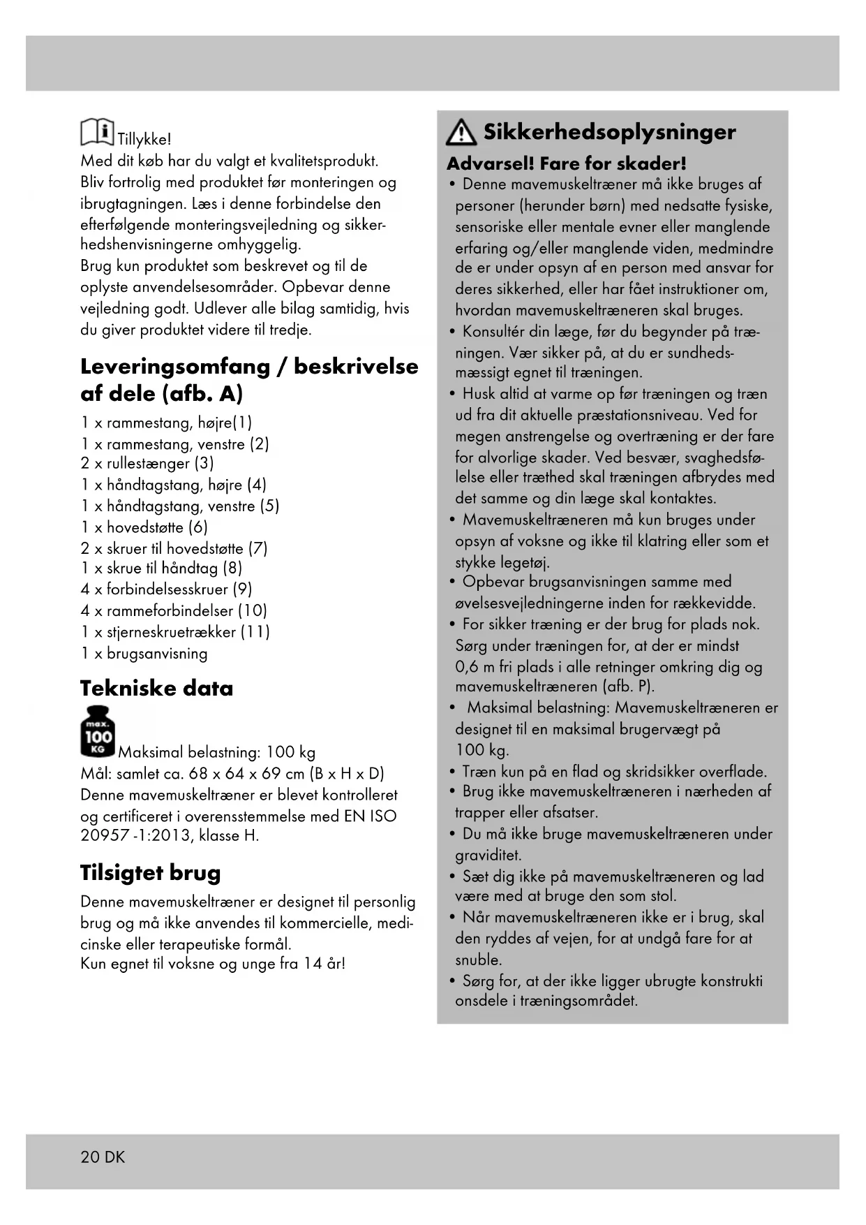 - Mavemuskeltræneren må kun bruges i fejlfri stand. Kontrollér produktet før hver brug for beskadigelser eller slid. Sikkerheden ved mavemuskeltræneren kan kun garanteres, hvis den regelmæssigt undersøges for skader og slid. I tilfælde af skader må den ikke længere bruges.