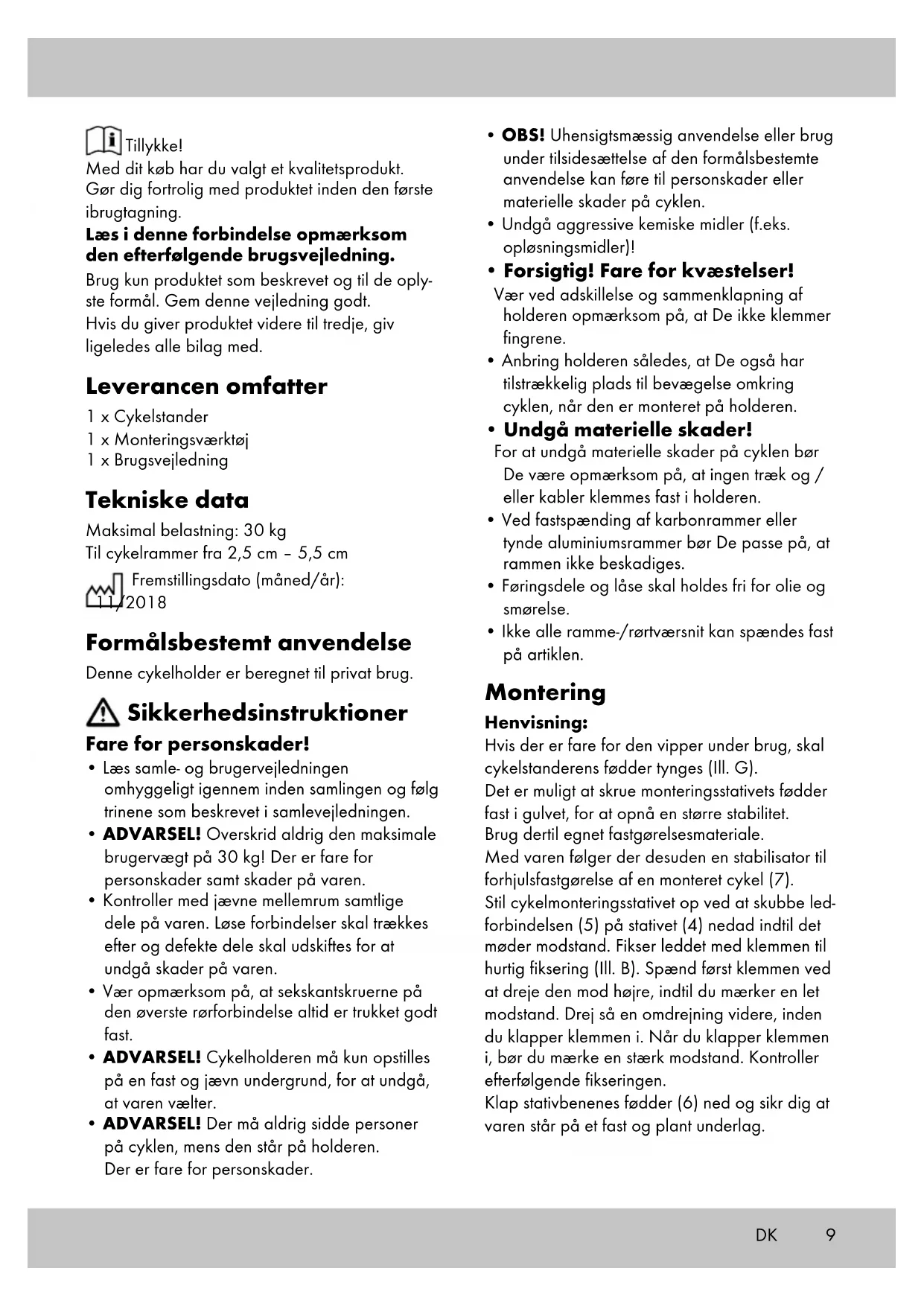 - Ikke alle ramme-/rørtværsnit kan spændes fast på artiklen. Montering Henvisning: Hvis der er fare for den vipper under brug, skal cykelstanderens fødder tynges (Ill. G). Det er muligt at skrue monteringsstativets fødder fast i gulvet, for at opnå en større stabilitet. Brug dertil egnet fastgørelsesmateriale. Med varen følger der desuden en stabilisator til forhjulsfastgørelse af en monteret cykel (7). Stil cykelmonteringsstativet op ved at skubbe led- forbindelsen (5) på stativet (4) nedad indtil det møder modstand. Fikser leddet med klemmen til hurtig fiksering (Ill. B). Spænd først klemmen ved at dreje den mod højre, indtil du mærker en let modstand. Drej så en omdrejning videre, inden du klapper klemmen i. Når du klapper klemmen i, bør du mærke en stærk modstand. Kontroller efterfølgende fikseringen. Klap stativbenenes fødder (6) ned og sikr dig at varen står på et fast og plant underlag. Tillykke! Med dit køb har du valgt et kvalitetsprodukt. Gør dig fortrolig med produktet inden den første ibrugtagning. Læs i denne forbindelse opmærksom den efterfølgende brugsvejledning. Brug kun produktet som beskrevet og til de oply- ste formål. Gem denne vejledning godt. Hvis du giver produktet videre til tredje, giv ligeledes alle bilag med. Leverancen omfatter 1 x Cykelstander 1 x Monteringsværktøj 1 x Brugsvejledning Tekniske data Maksimal belastning: 30 kg Til cykelrammer fra 2,5 cm – 5,5 cm Fremstillingsdato (måned/år): 11/2018 Formålsbestemt anvendelse Denne cykelholder er beregnet til privat brug. Sikkerhedsinstruktioner Fare for personskader!