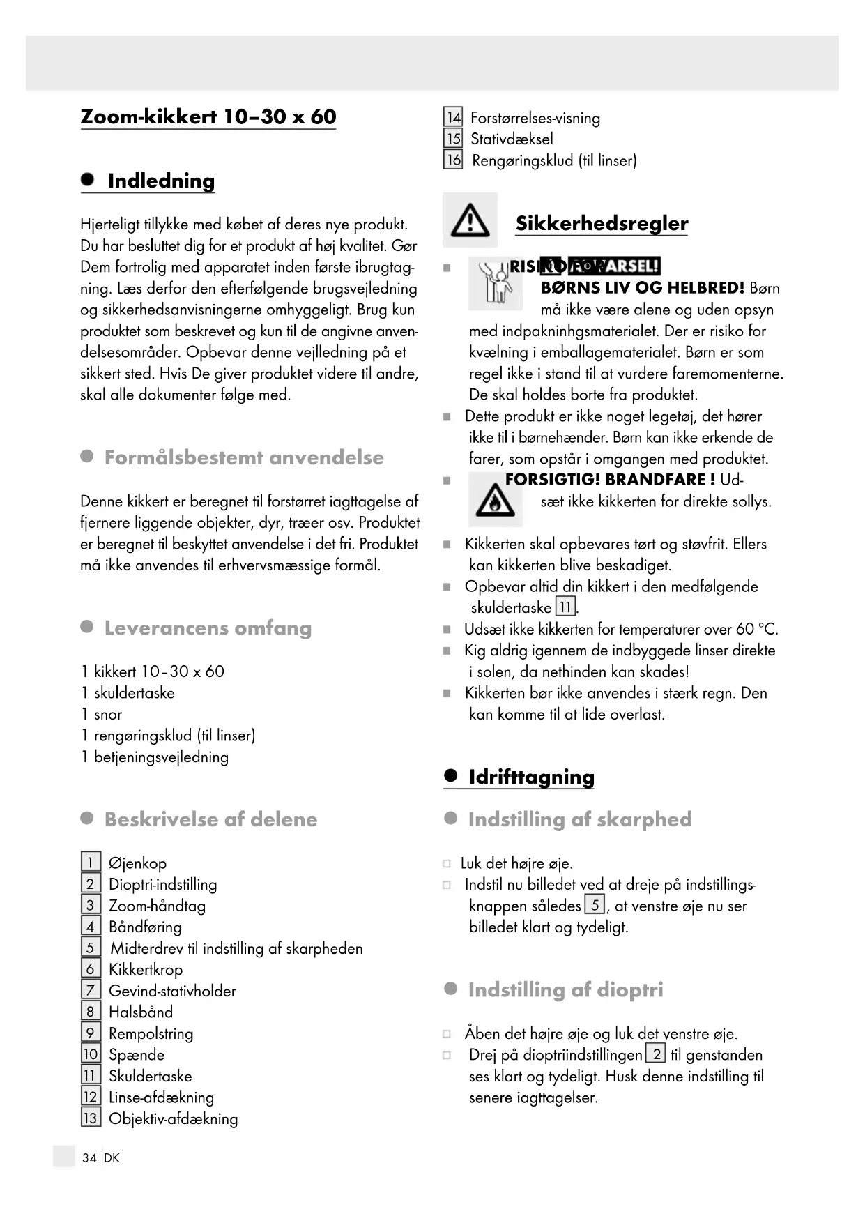 Rengøringsklud (til linser) Sikkerhedsregler RISIKO FOR BØRNS LIV OG HELBRED! Børn må ikke være alene og uden opsyn med indpakninhgsmaterialet. Der er risiko for kvælning i emballagematerialet. Børn er som regel ikke i stand til at vurdere faremomenterne. De skal holdes borte fra produktet. Dette produkt er ikke noget legetøj, det hører ikke til i børnehænder. Børn kan ikke erkende de farer, som opstår i omgangen med produktet. FORSIGTIG! BRANDFARE ! Ud- sæt ikke kikkerten for direkte sollys. Kikkerten skal opbevares tørt og støvfrit. Ellers kan kikkerten blive beskadiget. Opbevar altid din kikkert i den medfølgende skuldertaske
